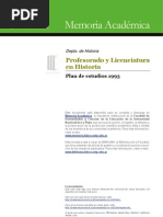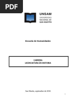 Unidad/es Academica/s: Secretara Acadmica. Carrera: Profesorado en Historia Ttulo que expide: Profesor en Historia Duracin en aos: 4 cuatro Modalidad de cursado: (presencial, distancia, semi-presencial) presencial Carga horaria total: TOTAL DE HORAS PRESENCIALES: 2.998 horas. Alcance del ttulo: El Profesorado en Historia capacitar para desempear las siguientes actividades profesionales: 1) la docencia en la educacin de nivel medio, la Educacin Secundaria Bsica y la enseanza superior; 2) el diseo, coordinacin y evaluacin de proyectos pedaggicos especficos del rea de historia y afines a otras disciplinas del rea de ciencias sociales; 3) la integracin de equipos de gestin educativa; 4) la realizacin de tareas de difusin del conocimiento histrico, tanto en el nivel acadmico como en el de divulgacin a la comunidad; 5) la intervencin en proyectos universitarios o extra-universitarios destinados a la preservacin de fuentes documentales y del patrimonio histrico. Organizacin del plan de estudios Organizacin general El plan de estudios del Profesorado en Historia consta de un total de 34 (treinta y cuatro) asignaturas, a dictarse en ocho (8) cuatrimestres. Organizacin especial El profesorado en Historia est organizado en seis ciclos de formacin acadmica: 1) 2) 3) 4) 5) 6) un ciclo de Formacin General, con cinco (5) asignaturas; un ciclo de Formacin Bsica Histrica, con ocho (8) asignaturas; un ciclo de Formacin Especial, con seis (6) asignaturas; un ciclo de Formacin Crtica, con cuatro (4) seminarios; un ciclo de Formacin Didctica, con seis (6) asignaturas; un ciclo de Formacin Complementaria, con cinco (5) asignaturas.