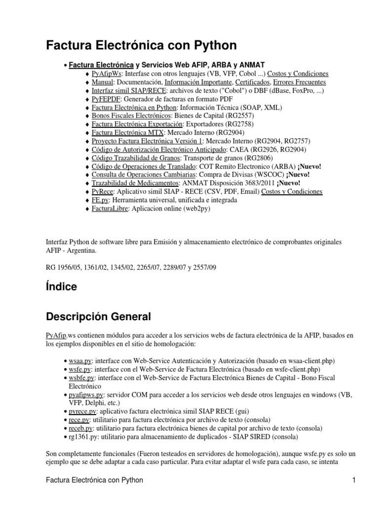 Factura Electrnica y Servicios Web AFIP, ARBA y ANMAT PyAfipWs: Interfase con otros lenguajes (VB, VFP, Cobol ...) Costos y Condiciones Manual: Documentacin, Informacin Importante, Certificados, Errores Frecuentes Interfaz simil SIAP/RECE: archivos de texto ("Cobol") o DBF (dBase, FoxPro, ...) PyFEPDF: Generador de facturas en formato PDF Factura Electrnica en Python: Informacin Tcnica (SOAP, XML) Bonos Fiscales Electrnicos: Bienes de Capital (RG2557) Factura Electrnica Exportacin: Exportadores (RG2758) Factura Electrnica MTX: Mercado Interno (RG2904) Proyecto Factura Electrnica Versin 1: Mercado Interno (RG2904, RG2757) Cdigo de Autorizacin Electrnico Anticipado: CAEA (RG2926, RG2904) Cdigo Trazabilidad de Granos: Transporte de granos (RG2806) Cdigo de Operaciones de Translado: COT Remito Electronico (ARBA) Nuevo! Consulta de Operaciones Cambiarias: Compra de Divisas (WSCOC) Nuevo! Trazabilidad de Medicamentos: ANMAT Disposicin 3683/2011 Nuevo! PyRece: Aplicativo simil SIAP - RECE (CSV, PDF, Email) Costos y Condiciones FE.py: Herramienta universal, unificada e integrada FacturaLibre: Aplicacion online (web2py)