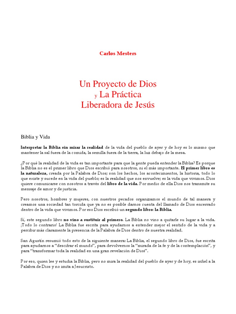 Interpretar la Biblia sin mirar la realidad de la vida del pueblo de ayer y de hoy es lo mismo que mantener la sal fuera de la comida, la semilla fuera de la tierra, la luz debajo de la mesa. Por qu la realidad de la vida es tan importante para que la gente pueda entender la Biblia? Es porque la Biblia no es el primer libro que Dios escribi para nosotros, ni el ms importante. El primer libro es la naturaleza, creada por la Palabra de Dios; son los hechos, los acontecimientos, la historia, todo lo que existe y sucede en la vida del pueblo; es la realidad que nos envuelve; es la vida que vivimos. Dios quiere comunicarse con nosotros a travs del libro de la vida. Por medio de ella Dios nos transmite su mensaje de amor y de justicia. Pero nosotros, hombres y mujeres, con nuestros pecados organizamos el mundo de tal manera y creamos una sociedad tan torcida que ya no es posible darnos cuenta del llamado de Dios encerrado dentro de la vida que vivimos. Por eso Dios escribi un segundo libro: la Biblia. S, este segundo libro no vino a sustituir al primero. La Biblia no vino a quitarle su lugar a la vida. Todo lo contrario! La Biblia fue escrita para ayudarnos a entender mejor el sentido de la vida y a percibir ms claramente la presencia de la Palabra de Dios dentro de nuestra realidad. San Agustn resumi todo esto de la siguiente manera: La Biblia, el segundo libro de Dios, fue escrita para ayudarnos a descifrar el mundo, para devolvernos la mirada de la fe y de la contemplacin, y para transformar toda la realidad en una gran revelacin de Dios. Por eso, quien lee y estudia la Biblia, pero no mira la realidad del pueblo de ayer y de hoy, es infiel a la Palabra de Dios y no imita a Jesucristo.