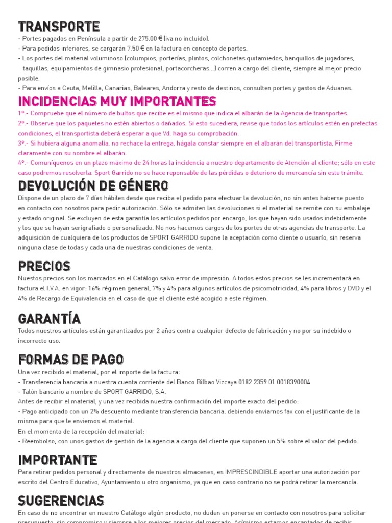 Una vez recibido el material, por el importe de la factura: - Transferencia bancaria a nuestra cuenta corriente del Banco Bilbao Vizcaya 0182 2359 01 0018390004 - Taln bancario a nombre de SPORT GARRIDO, S.A. Antes de recibir el material, y una vez recibida nuestra confirmacin del importe exacto del pedido: - Pago anticipado con un 2% descuento mediante transferencia bancaria, debiendo enviarnos fax con el justificante de la misma para que le enviemos el material. En el momento de la recepcin del material: - Reembolso, con unos gastos de gestin de la agencia a cargo del cliente que suponen un 5% sobre el valor del pedido.