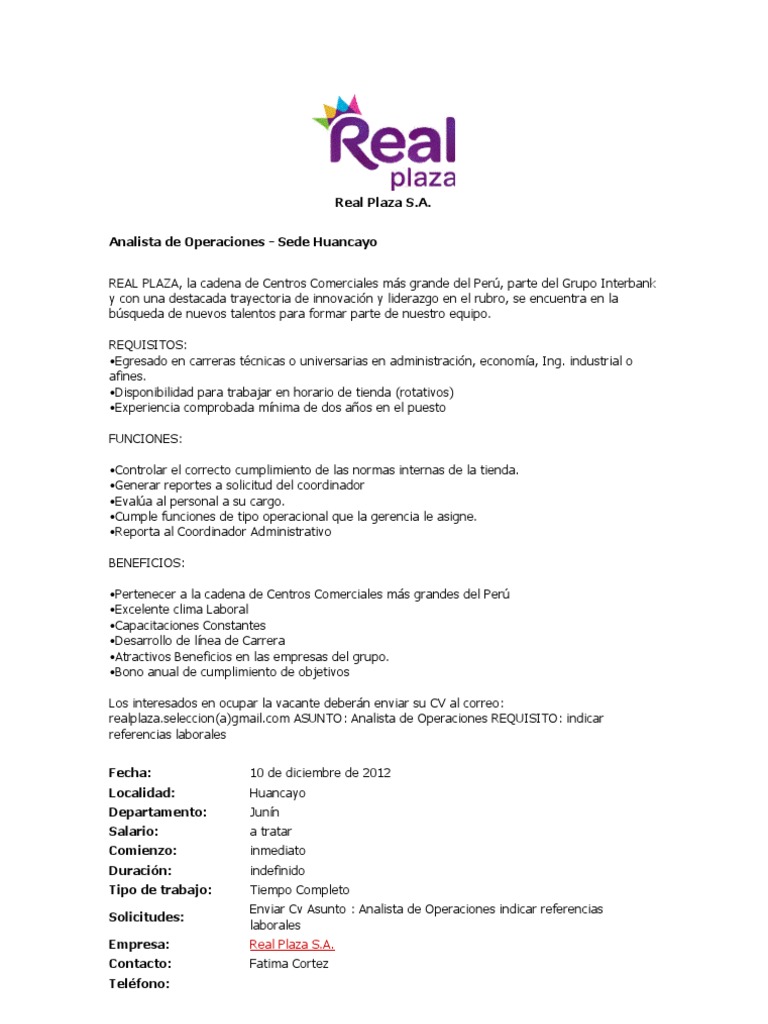Analista de Operaciones - Sede Huancayo REAL PLAZA, la cadena de Centros Comerciales ms grande del Per, parte del Grupo Interbank y con una destacada trayectoria de innovacin y liderazgo en el rubro, se encuentra en la bsqueda de nuevos talentos para formar parte de nuestro equipo. REQUISITOS: Egresado en carreras tcnicas o universarias en administracin, economa, Ing. industrial o afines. Disponibilidad para trabajar en horario de tienda (rotativos) Experiencia comprobada mnima de dos aos en el puesto FUNCIONES: Controlar el correcto cumplimiento de las normas internas de la tienda. Generar reportes a solicitud del coordinador Evala al personal a su cargo. Cumple funciones de tipo operacional que la gerencia le asigne. Reporta al Coordinador Administrativo BENEFICIOS: Pertenecer a la cadena de Centros Comerciales ms grandes del Per Excelente clima Laboral Capacitaciones Constantes Desarrollo de lnea de Carrera Atractivos Beneficios en las empresas del grupo. Bono anual de cumplimiento de objetivos Los interesados en ocupar la vacante debern enviar su CV al correo: [Link](a)[Link] ASUNTO: Analista de Operaciones REQUISITO: indicar referencias laborales Fecha: Localidad: Departamento: Salario: Comienzo: Duracin: Tipo de trabajo: Solicitudes: Empresa: Contacto: Telfono: 10 de diciembre de 2012 Huancayo Junn a tratar inmediato indefinido Tiempo Completo Enviar Cv Asunto : Analista de Operaciones indicar referencias laborales Real Plaza S.A. Fatima Cortez