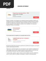 Corporacion Comercial Jerusalen SAC Prevencionista de Riesgos Jr. Prestigiosa empresa dedicada al servicio de proyectos de ingeniera y mantenimiento en telecomunicaciones, requiere incorporar a su staff de profesionales a un ING. PREVENCIONISTA DE RIESGOS JR. REQUISITOS: [Link] Mnimo de Bachiller en ingenieria Industrial, Quimica, Ambiental o afines. [Link] contar con cursos de especializacin o diplomados en Seguridad y Salud Ocupacional. [Link] mnima de 6 meses en empresas de construccin o montaje de estructuras metlicas. [Link] de legislacin nacional de SSO vigente, Elaboracion de IPER, llenado de AST, etc. [Link] manejo de Office. [Link] de comunicacin a todo nivel. FUNCIONES: [Link] a cabo las charlas de 5 minutos. [Link] por el cumplimiento de las normas y estandares de Seguridad y Salud Ocupacional en la Empresa. [Link] de reportes, inspecciones, y documentacin del proyecto asignado, etc. [Link] la documentacion del sistema. [Link] inherentes al puesto. Enviar su CV via correo indcando sus pretensiones salariales con indicacin en asunto: PDR Se requiere DISPONIBILIDAD INMEDIATA Fecha: Localidad: Departamento: Salario: Comienzo: Duracin: Tipo de trabajo: Solicitudes: Empresa: Contacto: Telfono: 9 de diciembre de 2012 Lima Lima de acuerdo a evaluacin Inmediato De acuerdo a desempeo Tiempo Completo enviar cv al correo indicando pretensiones salariales Corporacion Comercial Jerusalen SAC Edgar Gonzales