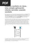 } [Link](s1); } // Fin del ciclo innito del servidor } // Fin del mtodo main } // Fin de la clase cliente: import [Link].*; import [Link].*; public class Cliente_Socket { public static void main( String args[] )throws IOException { Socket s=(Socket) null; DataInputStream canal_entrada_C; DataOutputStream canal_salida_C; try { s = new Socket (localhost,33525); canal_entrada_C = new DataInputStream ([Link]()); canal_salida_C = new DataOutputStream ([Link]()); canal_salida_C.writeUTF(hola mundo); [Link](El Cliente dice: hola mundo); String Resp = canal_entrada_C.readUTF(); [Link](El Servidor responde: + Resp); [Link](); } catch( IOException e ) { [Link]( No se puede conectar al servidor: +e ); } } // Fin del main } // Fin de la clase Cliente Responder 4. aldemaro dice: enero 29, 2012 a las 4:04 am gracias por el codigo man me ahorraste trabajo xD!!! Responder 5. Jonathan dice: enero 29, 2012 a las 4:05 am Men un gran aporte, me ayudo bastante.! GRACIAS Responder 6.