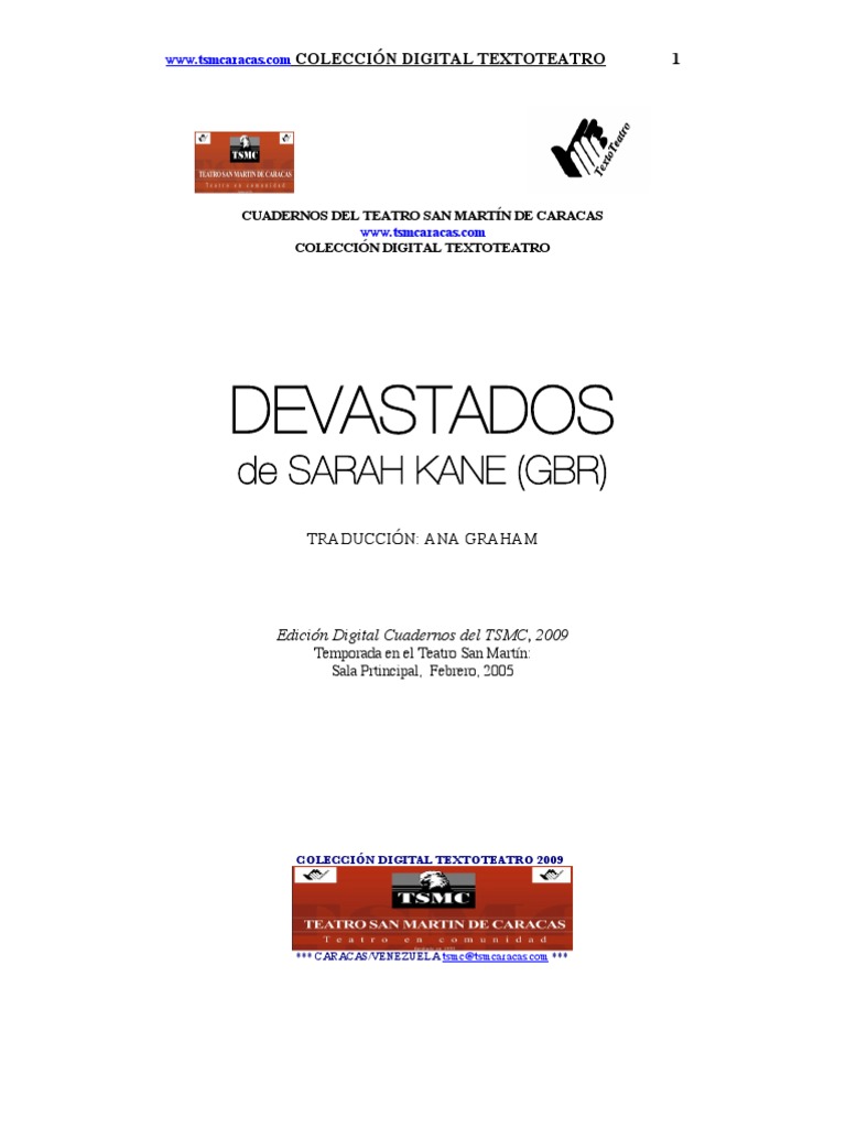 ADVERTENCIA: Todos los Derechos para la puesta en escena de esta obra sea en Teatro, Radio, Cine, Televisin o Lectura Pblica, estn reservados tanto para compaas Profesionales como Aficionados. Los Derechos y permisos deben obtenerse a travs del autor. Quedan reservados todos los derechos. Quedan especial y terminantemente prohibidos los siguientes actos sobre esta obra y sus contenidos; a) toda reproduccin, temporal o permanente, total o parcial, por cualquier medio o cualquier forma; b) la traduccin, adaptacin, reordenacin y cualquier otra modificacin; c) cualquier forma de distribucin de las obras o copias de la misma: d) cualquier forma de comunicacin , exhibicin o representacin de los resultados de los actos a los que se refiere la letra b). La infraccin de estos derechos podr conllevar el ejercicio de las acciones judiciales que en Derecho haya contra el infractor o los responsables de la infraccin. Los Derechos de estas piezas estn protegidos por las leyes de Propiedad Intelectual en todo el mundo y deben ser solicitados al autor o a su representante. NOTA: Se requiere de quienquiera que reciba el permiso de producir esta pieza, dar el crdito al Autor como nico Autor de la obra tanto en la portada de todos los programas distribudos en conexin con las representaciones de dicha obra como en todas las instancias en las cuales el ttulo de la obra aparezca sea con propsitos publicitarios, de publicacin o cualquier otra forma de usufructo de la obra o necesidad de la produccin. El Teatro San Martn de Caracas y sus Cuadernos Digitales NO tramitan los derechos para la representacin de la obra.