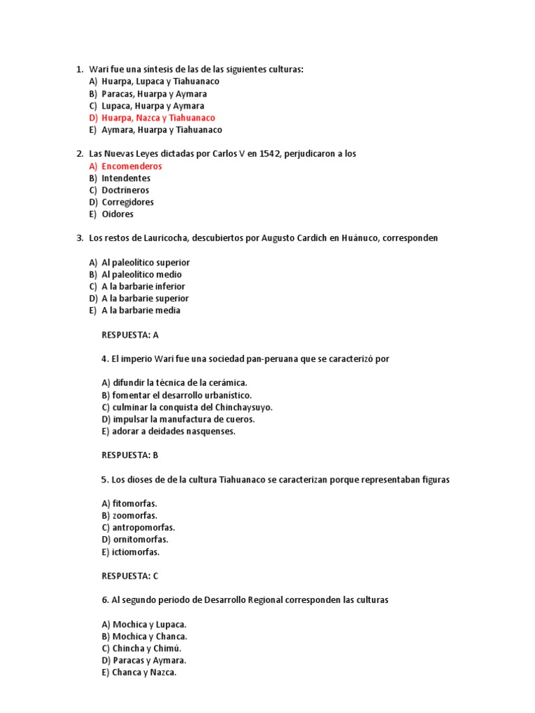 Wari fue una sntesis de las de las siguientes culturas: A) Huarpa, Lupaca y Tiahuanaco B) Paracas, Huarpa y Aymara C) Lupaca, Huarpa y Aymara D) Huarpa, Nazca y Tiahuanaco E) Aymara, Huarpa y Tiahuanaco 2. Las Nuevas Leyes dictadas por Carlos V en 1542, perjudicaron a los A) Encomenderos B) Intendentes C) Doctrineros D) Corregidores E) Oidores 3. Los restos de Lauricocha, descubiertos por Augusto Cardich en Hunuco, corresponden A) B) C) D) E) Al paleoltico superior Al paleoltico medio A la barbarie inferior A la barbarie superior A la barbarie media RESPUESTA: A 4. El imperio Wari fue una sociedad pan-peruana que se caracteriz por A) difundir la tcnica de la cermica. B) fomentar el desarrollo urbanstico. C) culminar la conquista del Chinchaysuyo. D) impulsar la manufactura de cueros. E) adorar a deidades nasquenses. RESPUESTA: B 5. Los dioses de de la cultura Tiahuanaco se caracterizan porque representaban figuras A) fitomorfas. B) zoomorfas. C) antropomorfas. D) ornitomorfas. E) ictiomorfas. RESPUESTA: C 6. Al segundo periodo de Desarrollo Regional corresponden las culturas A) Mochica y Lupaca. B) Mochica y Chanca. C) Chincha y Chim. D) Paracas y Aymara. E) Chanca y Nazca.