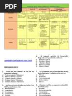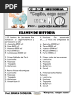 2. El Formativo Inicial es un periodo de notable desarrollo cultural. Entre los logros ms caractersticos se encuentran: a) la horticultura, la escultura, la ganadera. b) la alfarera, la orfebrera, la hidrulica. c) la cunicultura, la orfebrera, la escultura. d) la escultura, la hidrulica, la horticultura. e) la orfebrera, el pastoreo, la escultura. 3. Este periodo se caracteriz por el desarrollo de diversas culturas regionales, un gran desarrollo artesanal y el surgimiento de los estados militaristas teocrticos: a) Horizonte Temprano b) Intermedio Temprano c) Horizonte Medio d) Intermedio Tardo e) Horizonte Tardo 4. Los incas ordenaron construir Tambo Colorado, Tumibamba y Huanucopampa. Estos centros administrativos son llamados: a) tambos b) llaqtas c) callancas d) mallquis e) panacas 5. Cul de los siguientes hechos importantes, no le corresponde a Tupac Yupanqui: a) Siendo auqui derrot a Minchancamn b) Cruz el Oceano Pacfico y lleg a la Polinesia c) Fund Tumibamba en Ecuador d) Inici la construccin del Qoricancha e) Conquist etnias de Bolivia, Argentina y Chile. __________________________________________________ RESPUESTAS: 1. D 2. B