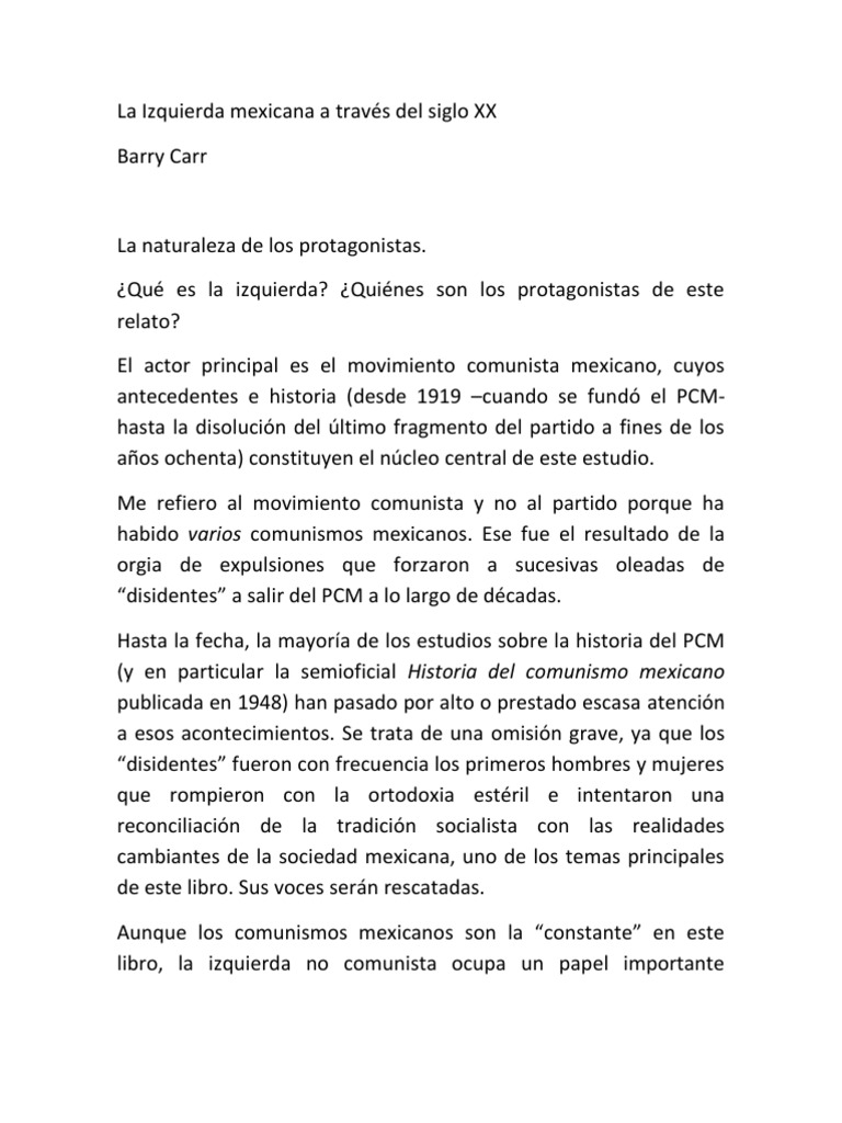 La naturaleza de los protagonistas. Qu es la izquierda? Quines son los protagonistas de este relato? El actor principal es el movimiento comunista mexicano, cuyos antecedentes e historia (desde 1919 cuando se fund el PCMhasta la disolucin del ltimo fragmento del partido a fines de los aos ochenta) constituyen el ncleo central de este estudio. Me refiero al movimiento comunista y no al partido porque ha habido varios comunismos mexicanos. Ese fue el resultado de la orgia de expulsiones que forzaron a sucesivas oleadas de disidentes a salir del PCM a lo largo de dcadas. Hasta la fecha, la mayora de los estudios sobre la historia del PCM (y en particular la semioficial Historia del comunismo mexicano publicada en 1948) han pasado por alto o prestado escasa atencin a esos acontecimientos. Se trata de una omisin grave, ya que los disidentes fueron con frecuencia los primeros hombres y mujeres que rompieron con la ortodoxia estril e intentaron una reconciliacin de la tradicin socialista con las realidades cambiantes de la sociedad mexicana, uno de los temas principales de este libro. Sus voces sern rescatadas. Aunque los comunismos mexicanos son la constante en este libro, la izquierda no comunista ocupa un papel importante