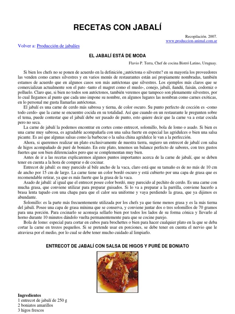 Aadimos sal y pimienta al gusto y dejamos hervir a fuego lento, al menos media hora ms para que espese. Aparte cocinamos las peras y las manzanas hasta formar una compota. Colocamos esta compota aparte en un recipiente para acompaar a la carne estofada. Presentamos en la misma cazuela de barro. ESTOFADO DE JABAL Ingredientes: 2 kilos carne jabal, 6 patatas medianas, 3 peras blanquilla, 3 Manzanas golden, 4 zanahorias. 1 Cebolla grande. 1 rollito hierbas aromticas, 1 vaso de aceite de oliva, 1 botella de vino tinto, 3 hojas de laurel. Sal y Pimienta. Mtodo Como en cualquier receta de caza, es conveniente esperar unos das despus de la muerte del animal, antes de cocinarla para que la carne pierda fuerza. La carne, troceada en tacos, como para cualquier estofado, se pone en un recipiente, preferentemente una cazuela de barro. Las manzanas y las peras se pelan, se trocean y se echan en la cazuela, junto con las zanahorias, cortadas en rodajas y la cebolla, pelada y cortada en gajos, se aaden las hierbas aromticas y el vino, de forma que lo cubra todo. Se tapa la cazuela y se deja macerar en un lugar fresco, no en el frigorfico, durante dos das. Transcurrido este tiempo, se cuela, recogiendo el vino que se reserva aparte. Del resto que queda en el colador, se separa por una parte la carne y por otra las zanahorias y los gajos de cebolla, desechando los trozos de pera, de manzana y las hierbas aromticas. Se pone una cazuela de barro al fuego con el aceite y se van echando los trozos de carne de forma que se vayan rehogando. Cuando la carne est bien rehogada, se le aade el vino, las zanahorias, la cebolla y el laurel. Cuando rompa a hervir, se baja el fuego y se deja a fuego lento y tapada, entre 45 minutos y 1 hora o ms, hasta que la carne est tierna. Si durante este tiempo el caldo mengua, se puede aadir Agua caliente. Una vez que la carne est tierna, se echan las patatas, cortadas a tacos grandes, estos tacos se hacen de forma que se inicia el corte y entonces se gira el cuchillo, dando un poco de tirn para que rompa la patata, de esta forma se ayuda a que espese la salsa. Se aade sal y pimienta al gusto y se deja hervir a fuego lento, al menos media hora ms para que espese. JABAL CLSICO Ingredientes: Un trozo de carne de jabal, para esta receta preferentemente carne del cuarto trasero o de la paleta. Apio, cebolla, Tomate, zanahoria, ajo, puerro. Laurel, tomillo, Pimienta negra partida. Extracto de tomate. Harina. Sal. Aceite. Vino tinto Merlot o Malbec son los mas indicados. Este tipo de preparacin tambin es til para otras carnes de caza como el Ciervo o el venado y para aprovechar los cortes mas duros. Cortes finos como son los lomos son aptos para cocciones rpidas donde se aprecia todo su sabor. Preparacin: Desgrasar la carne y cortarla en cubos grandes (3 x 3 cm.). Cortar todas las verduras tambin en trozos grandes.