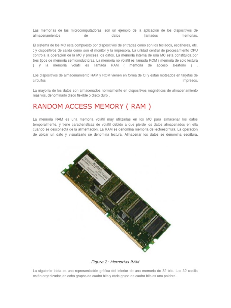 La memoria RAM es una memoria voltil muy utilizadas en los MC para almacenar los datos temporalmente, y tiene caractersticas de voltil debido a que pierde los datos almacenados en ella cuando se desconecta de la alimentacin. La RAM se denomina memoria de lectoescritura. La operacin de ubicar un dato y visualizarlo se denomina lectura. Almacenar los datos se denomina escritura.
