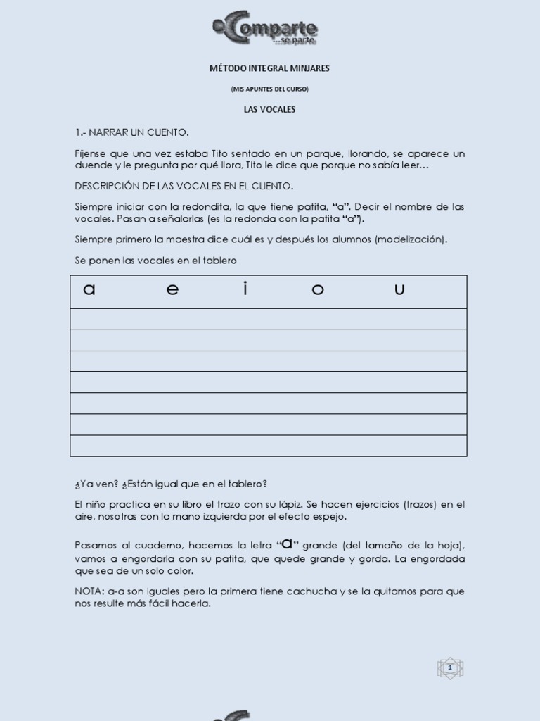 LAS VOCALES 1.- NARRAR UN CUENTO. Fjense que una vez estaba Tito sentado en un parque, llorando, se aparece un duende y le pregunta por qu llora, Tito le dice que porque no saba leer DESCRIPCIN DE LAS VOCALES EN EL CUENTO. Siempre iniciar con la redondita, la que tiene patita, a. Decir el nombre de las vocales. Pasan a sealarlas (es la redonda con la patita a). Siempre primero la maestra dice cul es y despus los alumnos (modelizacin). Se ponen las vocales en el tablero