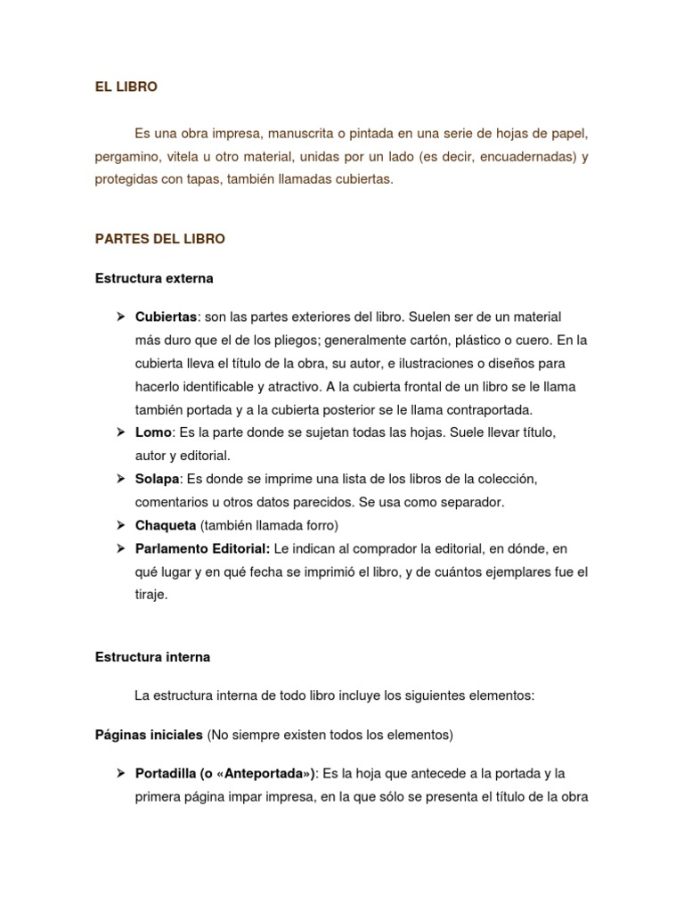 Introduccin Los libros no son solo hojas impresas llenas de texto o lustraciones. Estos estn compuestos de partes y cada una de ellas tiene un nombre y una funcin especfica. Tambin se llama libro a la imagen digital de un libro (vase libro digital), aunque carezca de papel y encuadernacin. Adems encontraremos las partes del mismo como son Sobrecubierta, Cubierta, Lomo, Guardas, Anteportada o Portadilla, Contra portada, Portada, Cuerpo de la Obra, Pgina, Prlogo o introduccin, ndice, Bibliografa entre otros.