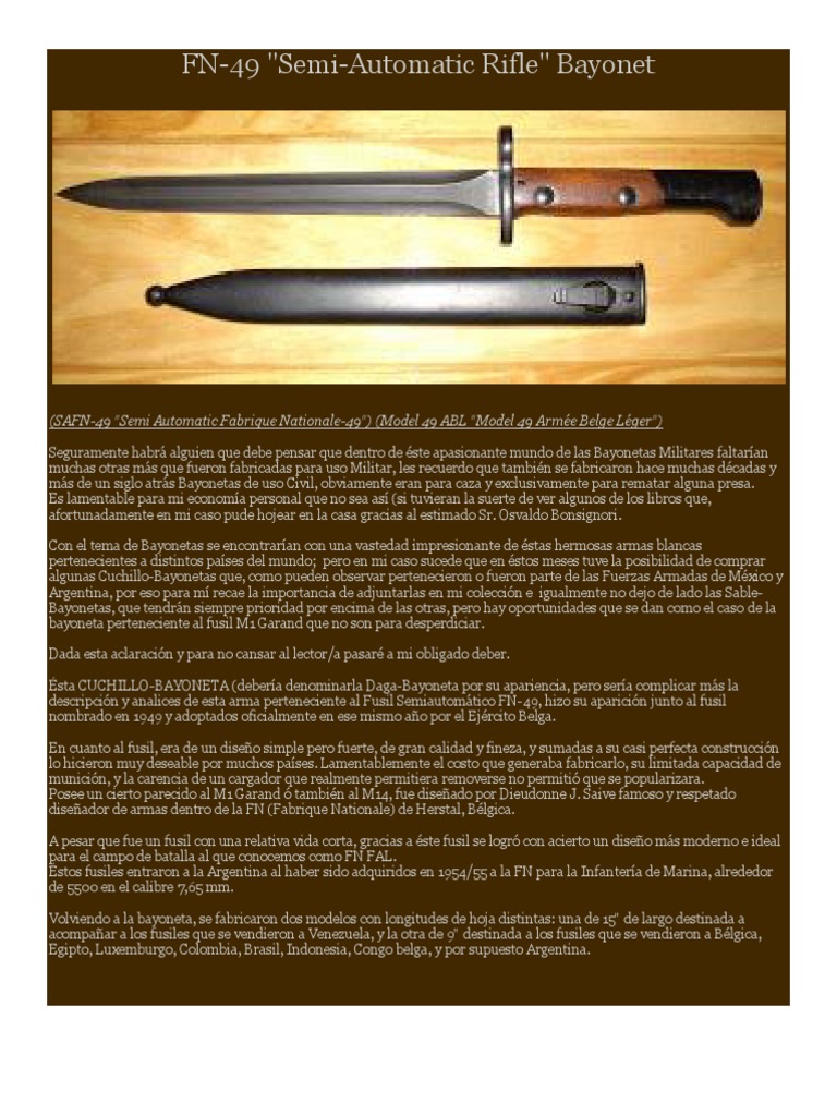 (SAFN-49 "Semi Automatic Fabrique Nationale-49") (Model 49 ABL "Model 49 Arme Belge Lger") Seguramente habr alguien que debe pensar que dentro de ste apasionante mundo de las Bayonetas Militares faltaran muchas otras ms que fueron fabricadas para uso Militar, les recuerdo que tambin se fabricaron hace muchas dcadas y ms de un siglo atrs Bayonetas de uso Civil, obviamente eran para caza y exclusivamente para rematar alguna presa. Es lamentable para mi economa personal que no sea as (si tuvieran la suerte de ver algunos de los libros que, afortunadamente en mi caso pude hojear en la casa gracias al estimado Sr. Osvaldo Bonsignori. Con el tema de Bayonetas se encontraran con una vastedad impresionante de stas hermosas armas blancas pertenecientes a distintos pases del mundo; pero en mi caso sucede que en stos meses tuve la posibilidad de comprar algunas Cuchillo-Bayonetas que, como pueden observar pertenecieron o fueron parte de las Fuerzas Armadas de Mxico y Argentina, por eso para m recae la importancia de adjuntarlas en mi coleccin e igualmente no dejo de lado las SableBayonetas, que tendrn siempre prioridad por encima de las otras, pero hay oportunidades que se dan como el caso de la bayoneta perteneciente al fusil M1 Garand que no son para desperdiciar. Dada esta aclaracin y para no cansar al lector/a pasar a mi obligado deber. sta CUCHILLO-BAYONETA (debera denominarla Daga-Bayoneta por su apariencia, pero sera complicar ms la descripcin y analices de esta arma perteneciente al Fusil Semiautomtico FN-49, hizo su aparicin junto al fusil nombrado en 1949 y adoptados oficialmente en ese mismo ao por el Ejrcito Belga. En cuanto al fusil, era de un diseo simple pero fuerte, de gran calidad y fineza, y sumadas a su casi perfecta construccin lo hicieron muy deseable por muchos pases. Lamentablemente el costo que generaba fabricarlo, su limitada capacidad de municin, y la carencia de un cargador que realmente permitiera removerse no permiti que se popularizara. Posee un cierto parecido al M1 Garand tambin al M14, fue diseado por Dieudonne J. Saive famoso y respetado diseador de armas dentro de la FN (Fabrique Nationale) de Herstal, Blgica. A pesar que fue un fusil con una relativa vida corta, gracias a ste fusil se logr con acierto un diseo ms moderno e ideal para el campo de batalla al que conocemos como FN FAL. stos fusiles entraron a la Argentina al haber sido adquiridos en 1954/55 a la FN para la Infantera de Marina, alrededor de 5500 en el calibre 7,65 mm. Volviendo a la bayoneta, se fabricaron dos modelos con longitudes de hoja distintas: una de 15" de largo destinada a acompaar a los fusiles que se vendieron a Venezuela, y la otra de 9" destinada a los fusiles que se vendieron a Blgica, Egipto, Luxemburgo, Colombia, Brasil, Indonesia, Congo belga, y por supuesto Argentina.