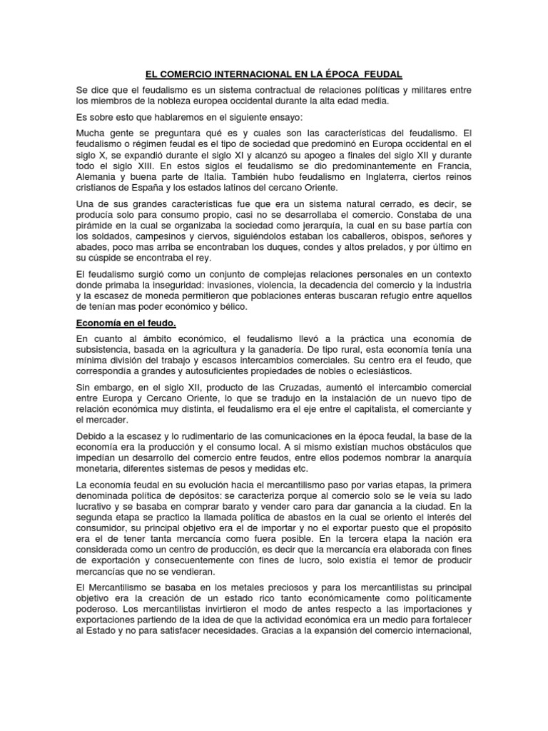 de la nobleza europea occidental durante la alta edad media. Es sobre esto que hablaremos en el siguiente ensayo: Mucha gente se preguntara qu es y cuales son las caractersticas del feudalismo. El feudalismo o rgimen feudal es el tipo de sociedad que predomin en Europa occidental en el siglo X, se expandi durante el siglo XI y alcanz su apogeo a finales del siglo XII y durante todo el siglo XIII. En estos siglos el feudalismo se dio predominantemente en Francia, Alemania y buena parte de Italia. Tambin hubo feudalismo en Inglaterra, ciertos reinos cristianos de Espaa y los estados latinos del cercano Oriente. Una de sus grandes caractersticas fue que era un sistema natural cerrado, es decir, se produca solo para consumo propio, casi no se desarrollaba el comercio. Constaba de una pirmide en la cual se organizaba la sociedad como jerarqua, la cual en su base parta con los soldados, campesinos y ciervos, siguindolos estaban los caballeros, obispos, seores y abades, poco mas arriba se encontraban los duques, condes y altos prelados, y por ltimo en su cspide se encontraba el rey. El feudalismo surgi como un conjunto de complejas relaciones personales en un contexto donde primaba la inseguridad: invasiones, violencia, la decadencia del comercio y la industria y la escasez de moneda permitieron que poblaciones enteras buscaran refugio entre aquellos de tenan mas poder econmico y blico. Economa en el feudo. En cuanto al mbito econmico, el feudalismo llev a la prctica una economa de subsistencia, basada en la agricultura y la ganadera. De tipo rural, esta economa tena una mnima divisin del trabajo y escasos intercambios comerciales. Su centro era el feudo, que corresponda a grandes y autosuficientes propiedades de nobles o eclesisticos. Sin embargo, en el siglo XII, producto de las Cruzadas, aument el intercambio comercial entre Europa y Cercano Oriente, lo que se tradujo en la instalacin de un nuevo tipo de relacin econmica muy distinta, el feudalismo era el eje entre el capitalista, el comerciante y el mercader. Debido a la escasez y lo rudimentario de las comunicaciones en la poca feudal, la base de la economa era la produccin y el consumo local. A si mismo existan muchos obstculos que impedan un desarrollo del comercio entre feudos, entre ellos podemos nombrar la anarqua monetaria, diferentes sistemas de pesos y medidas etc. La economa feudal en su evolucin hacia el mercantilismo paso por varias etapas, la primera denominada poltica de depsitos: se caracteriza porque al comercio solo se le vea su lado lucrativo y se basaba en comprar barato y vender caro para dar ganancia a la ciudad. En la segunda etapa se practico la llamada poltica de abastos en la cual se oriento el inters del consumidor, su principal objetivo era el de importar y no el exportar puesto que el propsito era el de tener tanta mercanca como fuera posible. En la tercera etapa la nacin era considerada como un centro de produccin, es decir que la mercanca era elaborada con fines de exportacin y consecuentemente con fines de lucro, solo exista el temor de producir mercancas que no se vendieran. El Mercantilismo se basaba en los metales preciosos y para los mercantilistas su principal objetivo era la creacin de un estado rico tanto econmicamente como polticamente poderoso. Los mercantilistas invirtieron el modo de antes respecto a las importaciones y exportaciones partiendo de la idea de que la actividad econmica era un medio para fortalecer al Estado y no para satisfacer necesidades. Gracias a la expansin del comercio internacional,