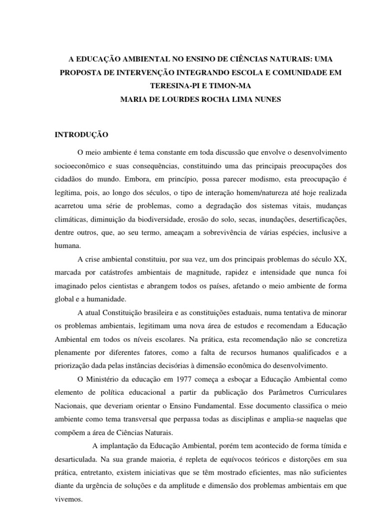 INTRODUO O meio ambiente tema constante em toda discusso que envolve o desenvolvimento socioeconmico e suas consequncias, constituindo uma das principais preocupaes dos cidados do mundo. Embora, em princpio, possa parecer modismo, esta preocupao legtima, pois, ao longo dos sculos, o tipo de interao homem/natureza at hoje realizada acarretou uma srie de problemas, como a degradao dos sistemas vitais, mudanas climticas, diminuio da biodiversidade, eroso do solo, secas, inundaes, desertificaes, dentre outros, que, ao seu termo, ameaam a sobrevivncia de vrias espcies, inclusive a humana. A crise ambiental constituiu, por sua vez, um dos principais problemas do sculo XX, marcada por catstrofes ambientais de magnitude, rapidez e intensidade que nunca foi imaginado pelos cientistas e abrangem todos os pases, afetando o meio ambiente de forma global e a humanidade. A atual Constituio brasileira e as constituies estaduais, numa tentativa de minorar os problemas ambientais, legitimam uma nova rea de estudos e recomendam a Educao Ambiental em todos os nveis escolares. Na prtica, esta recomendao no se concretiza plenamente por diferentes fatores, como a falta de recursos humanos qualificados e a priorizao dada pelas instncias decisrias dimenso econmica do desenvolvimento. O Ministrio da educao em 1977 comea a esboar a Educao Ambiental como elemento de poltica educacional a partir da publicao dos Parmetros Curriculares Nacionais, que deveriam orientar o Ensino Fundamental. Esse documento classifica o meio ambiente como tema transversal que perpassa todas as disciplinas e amplia-se naquelas que compem a rea de Cincias Naturais. A implantao da Educao Ambiental, porm tem acontecido de forma tmida e desarticulada. Na sua grande maioria, repleta de equvocos tericos e distores em sua prtica, entretanto, existem iniciativas que se tm mostrado eficientes, mas no suficientes diante da urgncia de solues e da amplitude e dimenso dos problemas ambientais em que vivemos.
