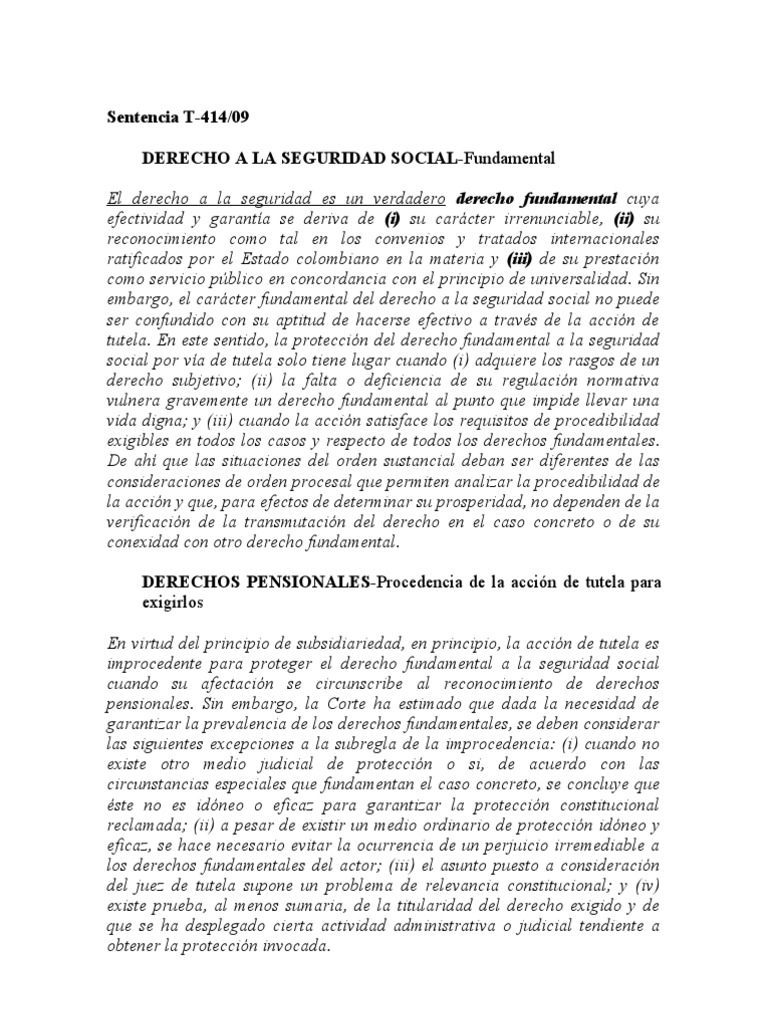 la accin de tutela para el reconocimiento de acreencias laborales, particularmente cuando estas corresponden a pensiones de jubilacin, el juez constitucional, de manera previa deber verificar que en el caso concreto concurran ciertos requisitos a saber: (i) que se trate de una persona de la tercera edad, para ser considerado sujeto especial de proteccin; (ii) que la falta de pago de la prestacin o su disminucin, genere un alto grado de afectacin de los derechos fundamentales, en particular del derecho al mnimo vital; (iii) que se haya desplegado cierta actividad administrativa y judicial por el interesado tendiente a obtener la proteccin de sus derechos; y (iv) que se acredite siquiera sumariamente, las razones por las cuales el medio judicial ordinario es ineficaz para lograr la proteccin inmediata de los derechos fundamentales presuntamente afectados. De este modo, deber analizarse en cada caso concreto si se verifican estos requerimientos a fin de declarar la procedencia del amparo. Igualmente, en la sentencia T-610 de 2008, esta Corporacin concluy: [L]a Corte Constitucional ha avanzado en el reconocimiento de la procedencia de la accin de tutela en relacin con pretensiones de naturaleza prestacional en materia de pensiones, en los casos en que: i) El mecanismo judicial ordinario de que dispone el interesado resulta ineficaz, por cuanto no resuelve el conflicto planteado de manera integral o no es lo suficientemente expedito frente a la exigencia de proteccin inmediata de los derechos amenazados (Sentencia T-851 de 2006); ii) el desconocimiento del derecho a la seguridad social en pensiones amenaza por conexidad derechos fundamentales como el mnimo vital y la vida digna; iii) la accin de tutela resulta necesaria para evitar la consumacin de un perjuicio iusfundamental irremediable; y iv) la falta de reconocimiento y pago de la pensin se origina en actuaciones que, prima facie, desvirtan la presuncin de legalidad que recae sobre las actuaciones de la administracin pblica (Sentencia T-851 de 2006). Sin embargo, de debe advertir que a la luz de la consideracin de que el derecho a la seguridad social es fundamental, la verificacin de algunos de tales requisitos, como por ejemplo la conexidad con el derecho fundamental al mnimo vital, resulta innecesaria. 26 Vanse las sentencias T-229 de 2009, T-021 de 2009, T-007 de 2009, T-938 de 2008, T-826 de 2008, T681 de 2008, T-634 de 2008, T-854 de 2007, T-628 de 2007, T-389 de 2007, T-1064 de 2006, T-701 de 2006 y T-860 de 2005.