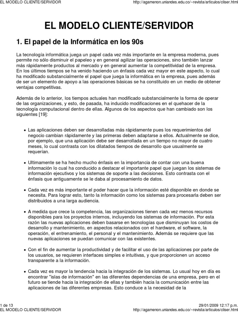 [17] Datapro Client/Server analyst. Using Client / Server computing to support or enable entreprise strategy. 1994 [18] Inmon W. H.. Client / Server applications in an architected environment, QED, Technical publishing group. [19] NCR. Client/Server computing, Open cooperative computing, the strategy for managing change. [20] Wenig Raymond P. , Pardoe Terry D., Fox Richard K.. Client / Server computing, Internacional Management Services Inc. [21] Datapro Client/Server Analyst, cliente server computing : emerging trends, solutions and strategies, 1994. Volver a.... Artculos Portada de la Revista Contenido de la Revista
