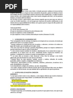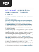 TEXTO Romanos 8 En Rom 5:1-11, Pablo ya comenz a describir algunos de los frutos de la justificacin en la vida del creyente. Ahora, habiendo contestado tres objeciones a su enseanza, Pablo en Rom 8:139 vuelve al tema de los frutos de la justificacin. Romanos 8 es uno de los captulos ms gloriosos de toda la Biblia. Tiene mucho contenido teolgico y prctico. Por falta de tiempo, tendremos que simplemente resumir las enseanzas importantes en este captulo, esperando que el estudiante tenga el inters de indagar ms estos temas personalmente. Podramos dividir Romanos 8 en TRES SECCIONES. 1. LA LIBERACIN "EN CRISTO" DE LA CONDENACIN DE LA LEY (v.1-4) En Rom 7:5 Pablo dijo que mientras una persona est "en la carne", su naturaleza pecaminosa usa la ley de Dios para manifestar su esclavitud al pecado, y por consiguiente lo condena ante Dios. Sin embargo, Pablo aade que es posible para el hombre encontrar la liberacin de la condenacin "de la ley" (Rom 7:6). La pregunta es, cmo? Esta condenacin que la ley produce por medio de la naturaleza pecaminosa del hombre es el tema de Rom 7:7-25, y Pablo llega a la misma pregunta en v.24: "quin me librar de este cuerpo de muerte?" El tema de Rom 8:1-4 es ste: cmo puede Dios liberar al hombre de la condenacin que la ley trae por medio de la naturaleza pecaminosa del hombre?" En dar respuesta a esta pregunta, Pablo vuelve a enfatizar el tema central de toda la carta a los Romanos; es decir, que todo ser humano est en una de dos posiciones: o est "en la carne" (= "en Adn"), o est "en Cristo Jess". Veamos primero lo que Pablo dice acerca de estas dos posiciones, y luego notaremos cmo el hombre puede ser liberado de la condenacin que viene por estar "en la carne". a. El Hombre "EN LA CARNE" y el Hombre "EN CRISTO" i. El Hombre "EN LA CARNE" Los que estn "en la carne" (= "en Adn") VIVEN "conforme a la carne" (v.1; comparar v.5); adems, estn sujetos a "la ley del pecado y de la muerte" (v.2; comparar Rom 7:5 y 8-11). Por consiguiente, tales personas estn bajo la condenacin de Dios1 (ver notas sobre v.5-11). ii. El Hombre "EN CRISTO JESUS"