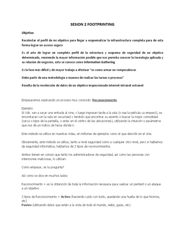 Empezaremos explicando un proceso muy conocido: Reconocimiento Ejemplo: Si Uds. van a sacar una entrada al cine, y luego ingresan tarde a la sala (o sea la pelcula ya empez), se encontraran con la sala en oscuridad y tendrn que encontrar su asiento o buscar la mejor comodidad (cerca o lejos de la pantalla, o estar en el centro de las ubicaciones), utilizando la intuicin o parmetros que nos d un indicio de hacia dnde ir. Este mtodo se utiliza en nuestras vidas, en millones de ejemplos como el que describ en el cine. Obviamente, este mtodo se utiliza, tanto a nivel seguridad como a cualquier otro nivel, pero si hablamos de seguridad informtica, hablamos de 2 tipos de reconocimientos. Ambos tienen en comn que tanto los administradores de seguridad, as como las personas con intenciones maliciosas, lo utilizan. Como empezar, es la pregunta? As como se dice en muchos lados: Reconocimiento = es la obtencin de toda la informacin necesaria para realizar un pentest o un ataque a un objetivo 2 tipos de Reconocimiento = Activo (haciendo ruido con tools, quedando una huella de lo que hicimos, etc) Pasivo (utilizando datos que estn a la vista de todo el mundo, webs, guas, etc)