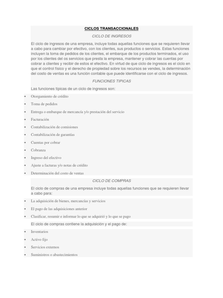 para efectuar una auditoria ms analtica y profunda del control interno, se requiere agrupar en forma ordenada las transacciones y caractersticas de cada empresa, es decir, realizar un ciclo transaccional en el que se originen ventas, compras de bienes y servicios, entrega y recaudo de dinero, contratacin de mano de obra y produccin, entre otros, para obtener un reconocimiento, calculo e informe de todos los procesos efectuados dentro de la misma.