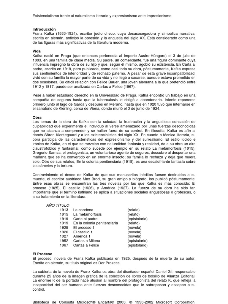 Introduccin Franz Kafka (1883-1924), escritor judo checo, cuya desasosegadora y simblica narrativa, escrita en alemn, anticip la opresin y la angustia del siglo XX. Est considerado como una de las figuras ms significativas de la literatura moderna. Vida Kafka naci en Praga (que entonces perteneca al Imperio Austro-Hngaro) el 3 de julio de 1883, en una familia de clase media. Su padre, un comerciante, fue una figura dominante cuya influencia impregn la obra de su hijo y que, segn l mismo, agobi su existencia. En Carta al padre, escrita en 1919, pero publicada, como casi toda su obra, pstumamente, Kafka expresa sus sentimientos de inferioridad y de rechazo paterno. A pesar de esta grave incompatibilidad, vivi con su familia la mayor parte de su vida y no lleg a casarse, aunque estuvo prometido en dos ocasiones. Su difcil relacin con Felice Bauer, una joven alemana a la que pretendi entre 1912 y 1917, puede ser analizada en Cartas a Felice (1967). Pese a haber estudiado derecho en la Universidad de Praga, Kafka encontr un trabajo en una compaa de seguros hasta que la tuberculosis le oblig a abandonarlo. Intento reponerse primero junto al lago de Garda y despus en Merano, hasta que en 1920 tuvo que internarse en el sanatorio de Kierling, cerca de Viena, donde muri el 3 de junio de 1924. Obra Los temas de la obra de Kafka son la soledad, la frustracin y la angustiosa sensacin de culpabilidad que experimenta el individuo al verse amenazado por unas fuerzas desconocidas que no alcanza a comprender y se hallan fuera de su control. En filosofa, Kafka es afn al dans Sren Kierkegaard y a los existencialistas del siglo XX. En cuanto a tcnica literaria, su obra participa de las caractersticas del expresionismo y del surrealismo. El estilo lcido e irnico de Kafka, en el que se mezclan con naturalidad fantasa y realidad, da a su obra un aire claustrofbico y fantasmal, como sucede por ejemplo en su relato La metamorfosis (1915). Gregorio Samsa, el protagonista, un voluntarioso agente de seguros, descubre al despertar una maana que se ha convertido en un enorme insecto; su familia lo rechaza y deja que muera solo. Otro de sus relatos, En la colonia penitenciaria (1919), es una escalofriante fantasa sobre las crceles y la tortura. Contraviniendo el deseo de Kafka de que sus manuscritos inditos fuesen destruidos a su muerte, el escritor austriaco Max Brod, su gran amigo y bigrafo, los public pstumamente. Entre esas obras se encuentran las tres novelas por las que Kafka es ms conocido: El proceso (1925), El castillo (1926), y Amrica (1927). La fuerza de su obra ha sido tan importante que el trmino kafkiano se aplica a situaciones sociales angustiosas o grotescas, o a su tratamiento en la literatura. AO TTULO 1913 1915 1919 1919 1925 1926 1927 1952 1967