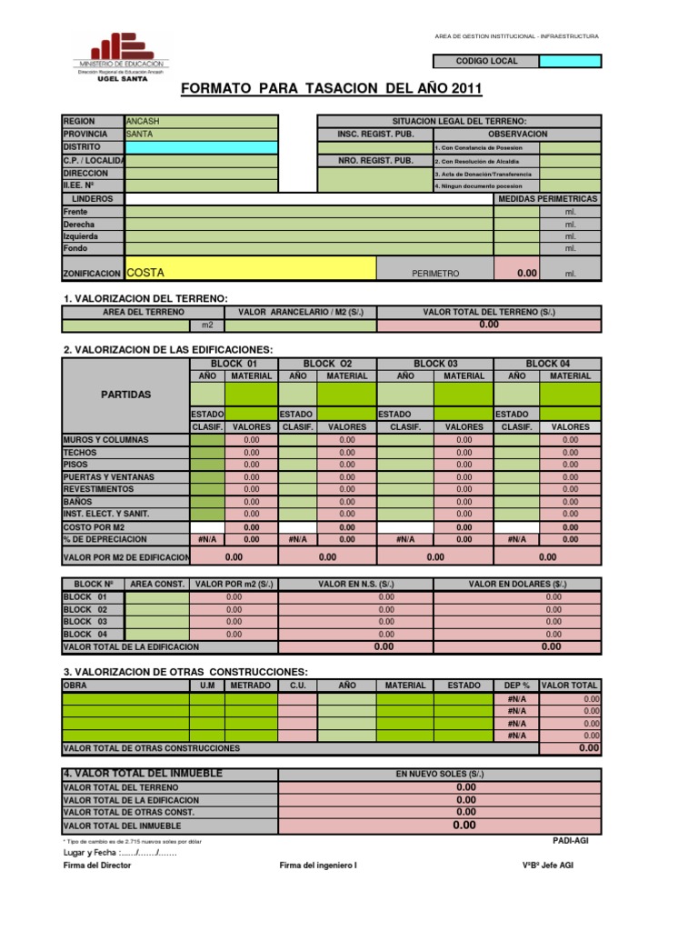 En el cuadro de Situacion Legal del Terreno, indicar SI o NO si la institucin esta inscrita en los Registros Pblicos (RPI y RPU). Si la respuesta en SI indicar el numero de Registro. Si la respuesta es NO, marcar con una X la situacin en la que se encuentra. En las medidas y colindancias elegir si los linderos estn determinados con referencia al frente del predio o en funcion al norte magntico, asi mismo indicar las medidas perimetricas. Valorizacin del terreno, ingresar el rea del terreno y el valor arancelario del terreno de acuerdo a los datos abtenidos de la municipalidad y automticamente se calcular el valor total del terreno. Valorizacin de las edificaciones, se ingresa el ao de construccion, material, estado de conservacion de cada bloque (pestaa desplegable). En la clasificacin (A, B, C, D, E, F, G, H) del bloque se selecciona segn los Valores Unitarios y segn la zona a la que corresponda la institucin. De esto resultar el valor por m2 de edificacin. SE ADJUNTA CUADRO DE VALORES UNITARIOS (VU). Indicar el rea contruida de acuerdo al plano de distribucion de cada bloque teniendo en cuenta que la unidad de medida es en m2. Y automticamente calcular el valor total de la Edificacin en soles y en dlares. En el caso de existir otras construcciones como pueden ser cerco perimtrico, losa deportiva entre otros llenar en el cuadro de Valorizacin de otras construcciones. Ingresar la obra, la unidad de medida, metrado, ao, material y estado de esta obra. Automticamente calcular el Costo Unitario (CU) y la DEP(%) y el Valor total. El cuadro 4 Valorizacin Total del Inmueble se calcular automticamente.