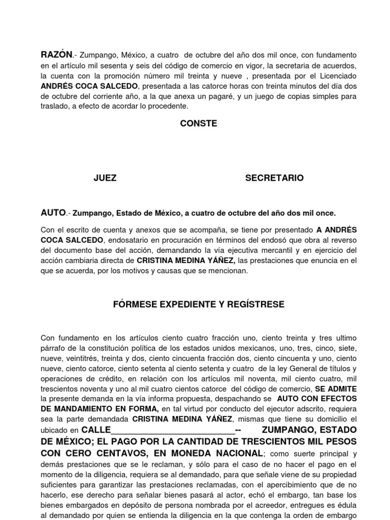 Con fundamento en los artculos ciento cuatro fraccin uno, ciento treinta y tres ultimo prrafo de la constitucin poltica de los estados unidos mexicanos, uno, tres, cinco, siete, nueve, veintitrs, treinta y dos, ciento cincuenta fraccin dos, ciento cincuenta y uno, ciento nueve, ciento catorce, ciento setenta al ciento setenta y cuatro de la ley General de ttulos y operaciones de crdito, en relacin con los artculos mil noventa, mil ciento cuatro, mil trescientos noventa y uno al mil cuatro cientos catorce del cdigo de comercio, SE ADMITE la presente demanda en la va informa propuesta, despachando se AUTO CON EFECTOS DE MANDAMIENTO EN FORMA, en tal virtud por conducto del ejecutor adscrito, requiera sea la parte demandada CRISTINA MEDINA YEZ, mismas que tiene su domicilio el ubicado en CALLE_________________________-ZUMPANGO, ESTADO