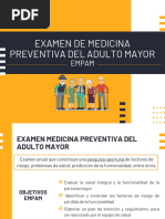 Instructivo de Aplicacin del Examen Anual de Medicina Preventiva del Adulto Mayor (EMPAM) El indicador que mejor nos entrega una visin del estado de salud del adulto mayor es la funcionalidad. El Examen Anual de Medicina Preventiva del Adulto Mayor, hace de este indicador su nudo central. A travs de la medicin de funcionalidad, se detectan los factores de riesgo, los que deben ser incorporados en el Plan de Salud, para actuar sobre ellos. Los objetivos del examen son: Evaluar la salud integral y la funcionalidad del adulto mayor Identificar y controlar los factores de riesgo de prdida de la funcionalidad Elaborar un plan de atencin y seguimiento, para ser ejecutado por el equipo de salud