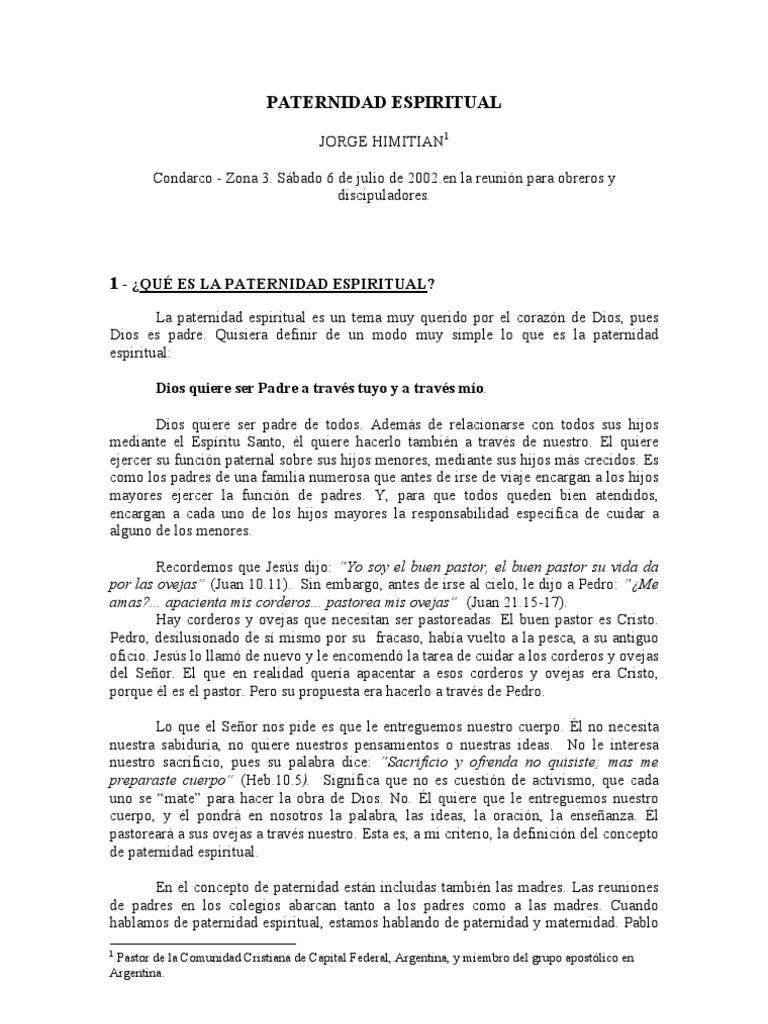 La paternidad espiritual es un tema muy querido por el corazn de Dios, pues Dios es padre. Quisiera definir de un modo muy simple lo que es la paternidad espiritual: Dios quiere ser Padre a travs tuyo y a travs mo. Dios quiere ser padre de todos. Adems de relacionarse con todos sus hijos mediante el Espritu Santo, l quiere hacerlo tambin a travs de nuestro. El quiere ejercer su funcin paternal sobre sus hijos menores, mediante sus hijos ms crecidos. Es como los padres de una familia numerosa que antes de irse de viaje encargan a los hijos mayores ejercer la funcin de padres. Y, para que todos queden bien atendidos, encargan a cada uno de los hijos mayores la responsabilidad especfica de cuidar a alguno de los menores. Recordemos que Jess dijo: Yo soy el buen pastor, el buen pastor su vida da por las ovejas (Juan 10.11). Sin embargo, antes de irse al cielo, le dijo a Pedro: Me amas?... apacienta mis corderos... pastorea mis ovejas (Juan 21.15-17). Hay corderos y ovejas que necesitan ser pastoreadas. El buen pastor es Cristo. Pedro, desilusionado de s mismo por su fracaso, haba vuelto a la pesca, a su antiguo oficio. Jess lo llam de nuevo y le encomend la tarea de cuidar a los corderos y ovejas del Seor. El que en realidad quera apacentar a esos corderos y ovejas era Cristo, porque l es el pastor. Pero su propuesta era hacerlo a travs de Pedro. Lo que el Seor nos pide es que le entreguemos nuestro cuerpo. l no necesita nuestra sabidura, no quiere nuestros pensamientos o nuestras ideas. No le interesa nuestro sacrificio, pues su palabra dice: Sacrificio y ofrenda no quisiste; mas me preparaste cuerpo (Heb.10.5). Significa que no es cuestin de activismo, que cada uno se mate para hacer la obra de Dios. No. l quiere que le entreguemos nuestro cuerpo, y l pondr en nosotros la palabra, las ideas, la oracin, la enseanza. l pastorear a sus ovejas a travs nuestro. Esta es, a mi criterio, la definicin del concepto de paternidad espiritual. En el concepto de paternidad estn incluidas tambin las madres. Las reuniones de padres en los colegios abarcan tanto a los padres como a las madres. Cuando hablamos de paternidad espiritual, estamos hablando de paternidad y maternidad. Pablo