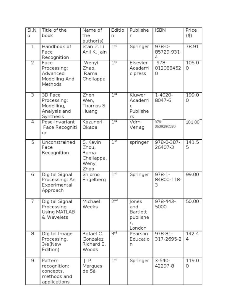 Name of Editio the n author(s) Stan Z. Li 1st Anil K. Jain Wenyi Zhao, Rama Chellappa Zhen Wen, Thomas S. Huang Kazunori Okada 1st