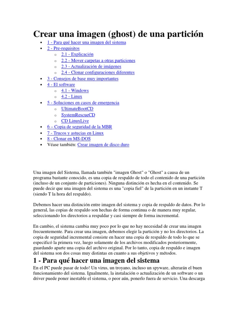 1 - Para qu hacer una imagen del sistema 2 - Pre-requisitos o 2.1 - Explicacin o 2.2 - Mover carpetas a otras particiones o 2.3 - Actualizacin de imgenes o 2.4 - Clonar configuraciones diferentes 3 - Consejos de base muy importantes 4 - El software o 4.1 - Windows o 4.2 - Linux 5 - Soluciones en casos de emergencia o UltimateBootCD o SystemRescueCD o CD LinuxLive 6 Copia de seguridad de la MBR 7 - Trucos y astucias en Linux 8 - Clonar en MS-DOS Vase tambin: Crear imagen de disco duro