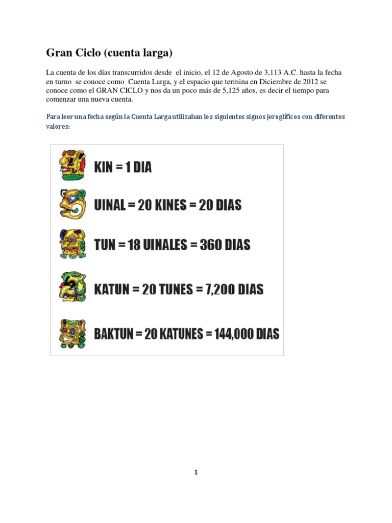 La cuenta de los das transcurridos desde el inicio, el 12 de Agosto de 3,113 A.C. hasta la fecha en turno se conoce como Cuenta Larga, y el espacio que termina en Diciembre de 2012 se conoce como el GRAN CICLO y nos da un poco ms de 5,125 aos, es decir el tiempo para comenzar una nueva cuenta.