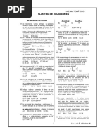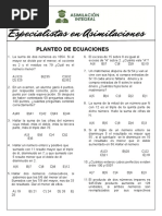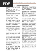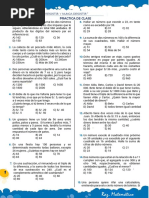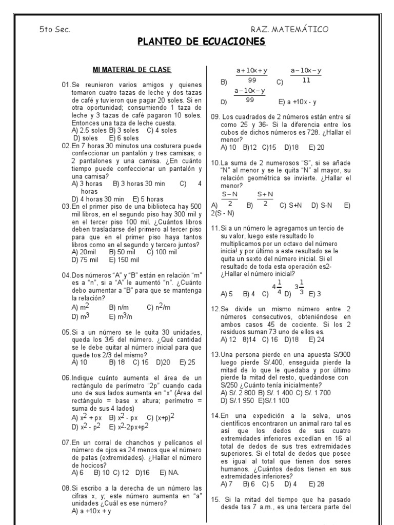 MI MATERIAL DE CLASE 01.Se reunieron varios amigos y quienes tomaron cuatro tazas de leche y dos tazas de caf y tuvieron que pagar 20 soles. Si en otra oportunidad; consumiendo 1 taza de leche y 3 tazas de caf pagaron 10 soles. Entonces una taza de leche cuesta. A) 2.5 soles B) 3 soles C) 4 soles D) soles E) 6 soles 02.En 7 horas 30 minutos una costurera puede confeccionar un pantaln y tres camisas; o 2 pantalones y una camisa. En cunto tiempo puede confeccionar un pantaln y una camisa? A) 3 horas B) 3 horas 30 min C) 4 horas D) 4 horas 30 min E) 5 horas 03.En el primer piso de una biblioteca hay 500 mil libros, en el segundo piso hay 300 mil y en el tercer piso 100 mil. Cuntos libros deben trasladarse del primero al tercer piso para que en el primer piso haya tantos libros como en el segundo y tercero juntos? A) 20mil B) 50 mil C) 100 mil D) 75 mil E) 150 mil 04.Dos nmeros A y B estn en relacin m es a n, si a A le aument n. Cunto debo aumentar a B para que se mantenga la relacin? A) m2 B) n/m C) n2/m 3 3/n D) m E) m 05.Si a un nmero se le quita 30 unidades, queda los 3/5 del nmero. Qu cantidad se le debe quitar al nmero inicial para que quede tos 2/3 del mismo? A) 10 B) 18 C) 15 D)20 E) 25 06.Indique cunto aumenta el rea de un rectngulo de permetro 2p cuando cada uno de sus lados aumenta en x (rea del rectngulo = base x altura; permetro = suma de sus 4 lados) A) x2 + px B) x2 - px C) (x+p)2 D) x2 - p2 E) x2-2px+p2 07.En un corral de chanchos y pelcanos el nmero de ojos es 24 menos que el nmero de patas (extremidades). Hallar el nmero de hocicos? A) 6 B) 10 C) 12 D)16 E) NA. 08.Si escribo a la derecha de un nmero las cifras x, y; este nmero aumenta en a unidades Cul es ese nmero? A) a +10x + y B)