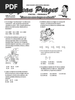09. Los cuadrados de 2 nmeros estn entre s como 25 y 36- Si la diferencia entre los cubos de dichos nmeros es 728. Hallar el menor? A) 10 B)12 C)15 D)18 E) 20 10.La suma de 2 numerosos S, si se aade N al menor y se le quita N al mayor, su relacin geomtrica se invierte. Hallar el menor? SN S+ N 2 2 A) B) C) S+N D) S-N E) 2(S - N) 11.Si a un nmero le agregamos un tercio de su valor, luego este resultado lo multiplicamos por un octavo del nmero inicia! y por ltimo a este resultado se le quita un sexto del nmero inicial. Si el resultado de toda esta operacin es2Hallar el nmero inicial? 1 1 4 3 A) 5 B) 4 C) 4 D) 3 E) 3 12.Se divide un mismo nmero entre 2 nmeros consecutivos, obtenindose en ambos casos 45 de cociente. Si los 2 residuos suman 73 uno de ellos es. A) 12 8)14 C) 16 D)18 E) 24 13.Una persona pierde en una apuesta S/300 luego pierde S/.400, enseguida pierde la mitad de lo que le quedaba y por ltimo pierde la mitad del resto, quedndose con S/250 Cunto tena inicialmente? A) S/. 2 800 B) S/. 1 400 C) S/. 1 700 D) S/.1 950 E)S/.1 100 14.En una expedicin a la selva, unos cientficos encontraron un animal raro tal es as que los dedos de sus cuatro extremidades inferiores excedan en 16 al total de dedos de sus tres extremidades superiores. Si el total de dedos que posee es igual al total que tienen dos seres humanos. Cuntos dedos tienen en sus extremidades inferiores? A) 7 B) 6 C) 5 D) 4 E) 28 15. Si la mitad del tiempo que ha pasado desde tas 7 a.m., es una tercera parte del