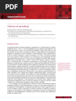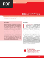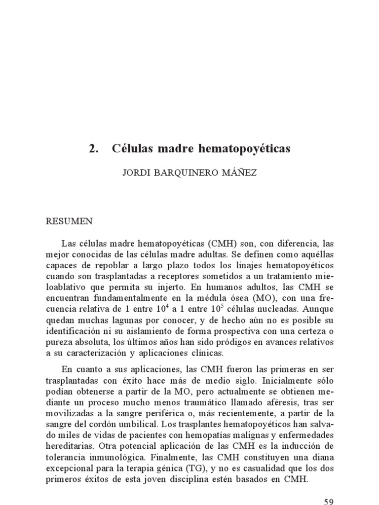 ABSTRACT Hematopoietic stem cells (HSC) are by far the best known among adult stem cells. They are defined by their ability to repopulate all hematopoietic lineages long-term upon transplantation into myeloablated hosts. In human adults, HSC are primarily found in the bone marrow at a relative frequency of 1 in 104 to 1 in 105 nucleated cells. Although many gaps remain and their prospective identification and isolation in pure form are still not possible, considerable progress has been made in the recent years both in their characterization and in their clinical applications. Regarding their applications, HSC were the first stem cells to be successfully transplanted, more than 50 years ago. Initially they could only be obtained from the bone marrow, but now they can be harvested using a much less painful procedure called apheresis, upon mobilization of the progenitor cells into the peripheral blood or, more recently, from umbilical cord blood. Hematopoietic transplants have saved thousands of patients with hematological malignancies and with genetic diseases. Another potential application of HSC is the induction of immune tolerance. Finally, HSC constitute a preferred target for gene therapy, and it is not by chance that the first two successful clinical trials reported so far were based on HSC. INTRODUCCIN El creciente xito del trasplante hematopoytico ha constituido durante ms de medio siglo el paradigma de la existencia de clulas madre adultas. Hasta hace poco ms de una dcada, hablar de clulas madre no embrionarias era referirse casi inequvocamente a la MO o a las CMH, ya que fueron stas las primeras en conocerse y en ser aplicadas al tratamiento de enfermedades humanas. Al ser el hematopoytico un tejido lquido trasplantable que se puede cultivar y manipular ex vivo, las CMH se han convertido en una herramienta insustituible para un sinfn de terapias celulares y aplicaciones en medicina regenerativa, as como en una diana preferida para la TG. La hematopoyesis (palabra que literalmente significa fabricacin o produccin de sangre, y que indirectamente lleva implcita la nocin de 60