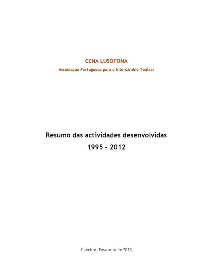 manifestaes teatrais de rua africanas, o Auto de Floripes, que anualmente se realiza na Ilha do Prncipe. Ainda neste mbito, a Cena Lusfona lanou em 2002 o cenaberta, um jornal com duas verses, em papel e em formato digital, que pretende ser um espao noticioso dedicado s iniciativas da associao e, em geral, s actividades culturais e teatrais da comunidade de lngua portuguesa. Em todas as iniciativas da Cena Lusfona aparece, at 2005, a frmula com o alto patrocnio do Ministrio da Cultura e da Cmara Municipal de Coimbra. A partir dessa altura, a associao deixou de contar com qualquer apoio do Ministrio da Cultura Portugus, o que condicionou gravemente a sua capacidade de trabalho. Os anos de 2007 e 2008 ficaram marcados pela luta pela sobrevivncia e pela procura de fontes de financiamento que permitissem no desperdiar o investimento que havia sido feito nos anos anteriores. A partir de 2009, a Cena Lusfona recuperou alguns dos seus projectos mais marcantes, nomeadamente ao nvel do Centro de Documentao e da Edio (incluindo a base de dados de espaos cnicos), ao nvel da investigao sobre as artes performativas tradicionais (com destaque para o ciclo Narradores Orais) e ao nvel do Forum (com a organizao dos Encontros Internacionais sobre Polticas de Intercmbio e o regresso das sesses de A Cena no Caf). Tambm em 2009, a Cmara Municipal de Coimbra viu aprovado o financiamento para a recuperao da Ala Central do Colgio das Artes, no Ptio da Inquisio, em Coimbra. Aqui funcionaro, a partir de 2013, as novas instalaes da Cena Lusfona, que incluiro um espao nobre e funcional para alojar o Centro de Documentao, permitindo optimizar as condies de utilizao por parte do pblico. Entre 2012 e 2014, as actividades centram-se no projecto P-STAGE: IV Estgio Internacional de Actores Lusfonos, financiado pela Unio Europeia e pelo Secretariado dos Pases ACP no mbito do programa ACPCultures. desenvolvido em parceria com o Elinga Teatro (Angola) e a AD Aco para o Desenvolvimento (Guin-Bissau) e tem como associados o Centro de Intercmbio Teatral de So Tom e Prncipe, o Teatro Vila Velha (Salvador, Brasil) e o Centro Dramtico Galego (Espanha). Inclui aces de formao em trs pases africanos de lngua portuguesa (Angola, Guin-Bissau e So Tom e Prncipe) e uma co-produo internacional, com actores destes pases e ainda actores profissionais portugueses e brasileiros.