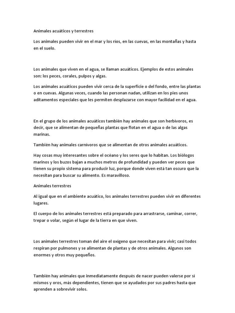 En el grupo de los animales acuticos tambin hay animales que son herbvoros, es decir, que se alimentan de pequeas plantas que flotan en el agua o de las algas marinas. Tambin hay animales carnvoros que se alimentan de otros animales acuticos. Hay cosas muy interesantes sobre el ocano y los seres que lo habitan. Los bilogos marinos y los buzos bajan a muchos metros de profundidad y pueden ver peces que tienen su propio sistema para producir luz, porque donde viven est tan oscuro que la necesitan para buscar su alimento. Es maravilloso. Animales terrestres Al igual que en el ambiente acutico, los animales terrestres pueden vivir en diferentes lugares. El cuerpo de los animales terrestres est preparado para arrastrarse, caminar, correr, trepar o volar, segn el lugar de la tierra en que viven.