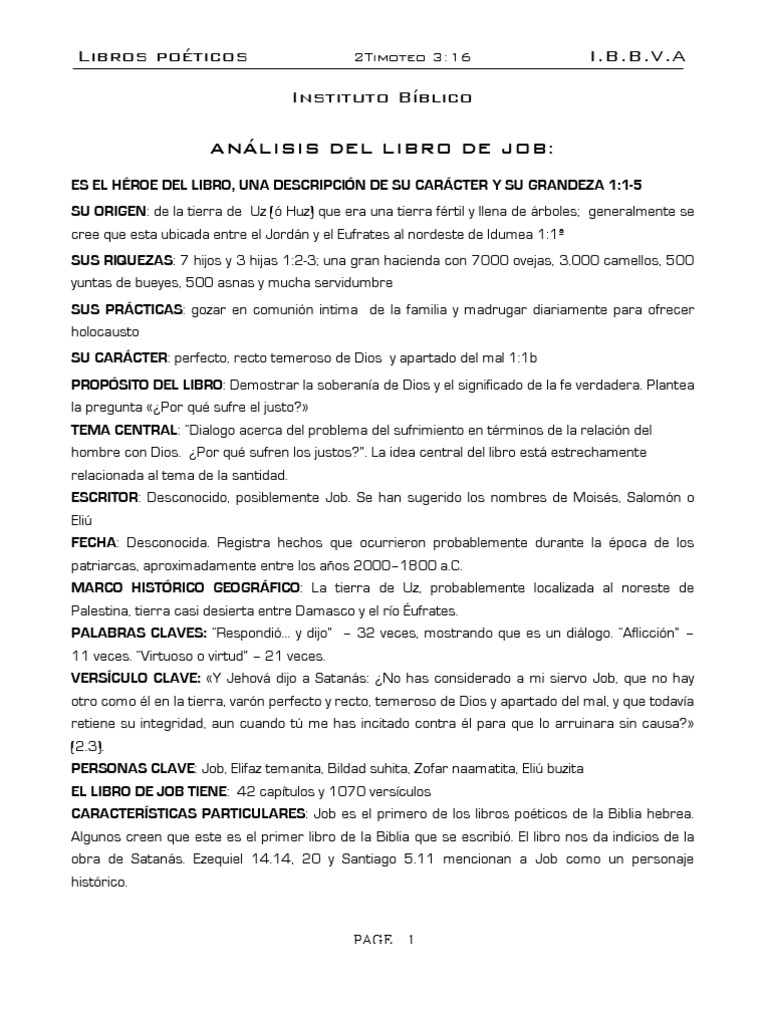 ES EL HROE DEL LIBRO, UNA DESCRIPCIN DE SU CARCTER Y SU GRANDEZA 1:1-5 SU ORIGEN: de la tierra de Uz ( Huz) que era una tierra frtil y llena de rboles; generalmente se cree que esta ubicada entre el Jordn y el Eufrates al nordeste de Idumea 1:1 SUS RIQUEZAS: 7 hijos y 3 hijas 1:2-3; una gran hacienda con 7000 ovejas, 3.000 camellos, 500 yuntas de bueyes, 500 asnas y mucha servidumbre SUS PRCTICAS: gozar en comunin intima de la familia y madrugar diariamente para ofrecer holocausto SU CARCTER: perfecto, recto temeroso de Dios y apartado del mal 1:1b PROPSITO DEL LIBRO: Demostrar la soberana de Dios y el significado de la fe verdadera. Plantea la pregunta Por qu sufre el justo? TEMA CENTRAL: Dialogo acerca del problema del sufrimiento en trminos de la relacin del hombre con Dios. Por qu sufren los justos?. La idea central del libro est estrechamente relacionada al tema de la santidad. ESCRITOR: Desconocido, posiblemente Job. Se han sugerido los nombres de Moiss, Salomn o Eli FECHA: Desconocida. Registra hechos que ocurrieron probablemente durante la poca de los patriarcas, aproximadamente entre los aos 20001800 a.C. MARCO HISTRICO GEOGRFICO: La tierra de Uz, probablemente localizada al noreste de Palestina, tierra casi desierta entre Damasco y el ro ufrates. PALABRAS CLAVES: Respondi... y dijo 32 veces, mostrando que es un dilogo. Afliccin 11 veces. Virtuoso o virtud 21 veces. VERSCULO CLAVE: Y Jehov dijo a Satans: No has considerado a mi siervo Job, que no hay otro como l en la tierra, varn perfecto y recto, temeroso de Dios y apartado del mal, y que todava retiene su integridad, aun cuando t me has incitado contra l para que lo arruinara sin causa? (2.3). PERSONAS CLAVE: Job, Elifaz temanita, Bildad suhita, Zofar naamatita, Eli buzita EL LIBRO DE JOB TIENE: 42 captulos y 1070 versculos CARACTERSTICAS PARTICULARES: Job es el primero de los libros poticos de la Biblia hebrea. Algunos creen que este es el primer libro de la Biblia que se escribi. El libro nos da indicios de la obra de Satans. Ezequiel 14.14, 20 y Santiago 5.11 mencionan a Job como un personaje histrico.