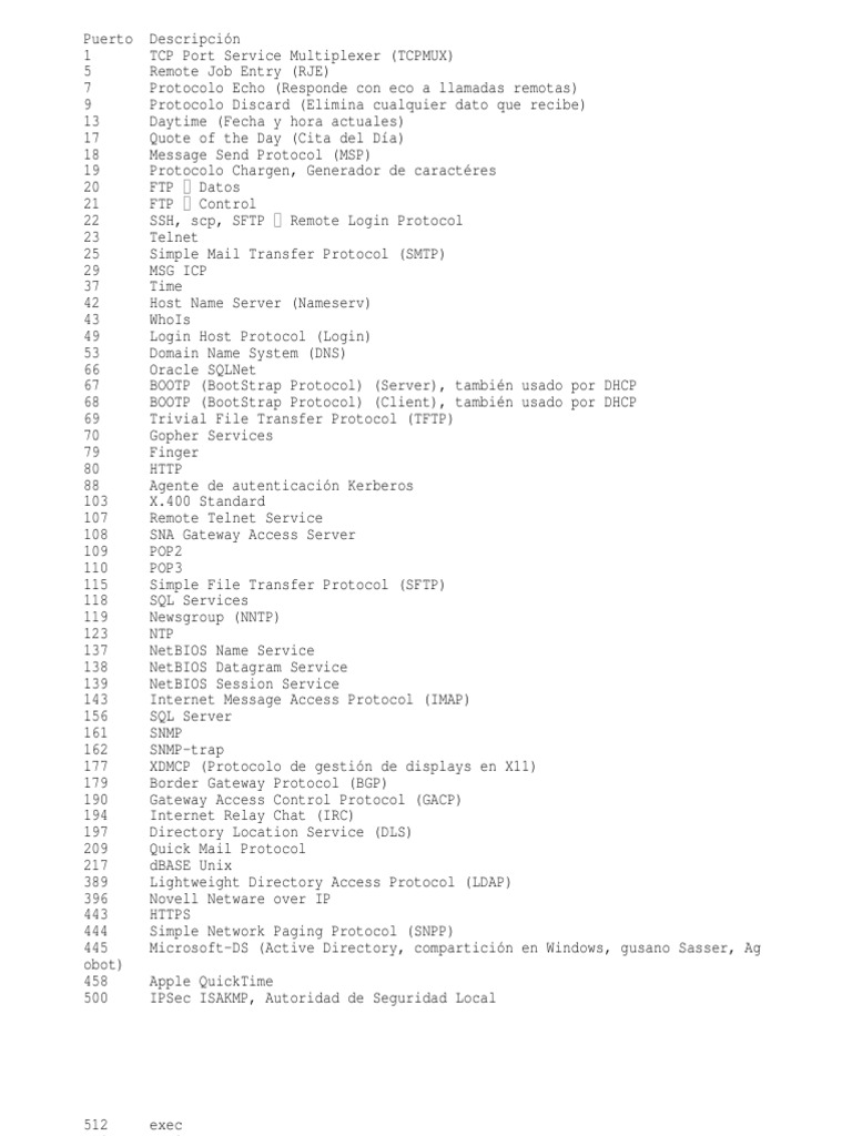 exec login syslog usado para logs del sistema Printer RIP Netmeeting Conference DHCP Client DHCP Server SNEWS MSN CUPS: sistema de impresin de Unix identificacin de Doom para jugar sobre TCP Telnet SSL IMAP4 SSL POP3 SSL Socks Proxy IBM Lotus Notes/Domino RCP Microsoft-SQL-Server Microsoft-SQL-Monitor Citrix MetaFrame Cliente ICA WINS Oracle listener Enrutamiento y Acceso Remoto para VPN con L2TP Enrutamiento y Acceso Remoto para VPN con PPTP Novell Zenworks Remote Control utility MSN Messenger NFS CPanel WHM (Web Host Manager) Cisco MGCP Calista IP phone (saliente) NetPanzer Squid Proxy MySQL Microsoft Terminal Server Novell agente de impresin NDPS SubVersion AIM Talk eMule eMule RAdmin UPNP (Universal plug-and-play) SIP (Session Initiation Protocol) Calista IP phone (entrante) XMPP/Jabber: conexin de cliente XMPP/Jabber: puerto por defecto para conexiones de cliente SSL XMPP/Jabber: conexin de servidor PostgreSQL VNC (Virtual Network Computing) Setiqueue proyecto SETI@Home pcAnyWhere (host) pcAnyWhere (host) VNC (Virtual Network Computing) VNC (Virtual Network Computing) VNC (Virtual Network Computing) VNC (Virtual Network Computing) VNC (Virtual Network Computing) VNC (Virtual Network Computing) X11 usado para X-windows
