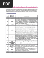 Descripcin TCP Port Service Multiplexer (TCPMUX) Remote Job Entry (RJE) Protocolo Echo (Responde con eco a llamadas remotas) Protocolo Discard (Elimina cualquier dato que recibe) Daytime (Fecha y hora actuales) Quote of the Day (Cita del Da) Message Send Protocol (MSP) Protocolo Chargen, Generador de caractres FTP Datos FTP Control SSH, scp, SFTP Remote Login Protocol Telnet Simple Mail Transfer Protocol (SMTP) MSG ICP Time Host Name Server (Nameserv) WhoIs Login Host Protocol (Login) Domain Name System (DNS) Oracle SQLNet BOOTP (BootStrap Protocol) (Server), tambin usado por DHCP BOOTP (BootStrap Protocol) (Client), tambin usado por DHCP Trivial File Transfer Protocol (TFTP) Gopher Services Finger HTTP Agente de autenticacin Kerberos X.400 Standard Remote Telnet Service SNA Gateway Access Server POP2 POP3 Simple File Transfer Protocol (SFTP) SQL Services Newsgroup (NNTP) NTP NetBIOS Name Service NetBIOS Datagram Service NetBIOS Session Service Internet Message Access Protocol (IMAP) SQL Server SNMP SNMP-trap XDMCP (Protocolo de gestin de displays en X11) Border Gateway Protocol (BGP) Gateway Access Control Protocol (GACP) Internet Relay Chat (IRC) Directory Location Service (DLS) Quick Mail Protocol dBASE Unix Lightweight Directory Access Protocol (LDAP) Novell Netware over IP HTTPS Simple Network Paging Protocol (SNPP) Microsoft-DS (Active Directory, comparticin en Windows, gusano Sasser, Ag Apple QuickTime IPSec ISAKMP, Autoridad de Seguridad Local