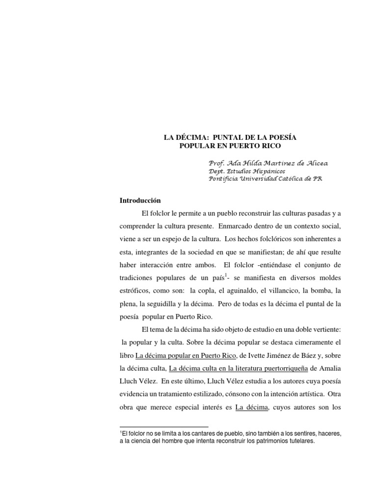 Introduccin El folclor le permite a un pueblo reconstruir las culturas pasadas y a comprender la cultura presente. Enmarcado dentro de un contexto social, viene a ser un espejo de la cultura. Los hechos folclricos son inherentes a esta, integrantes de la sociedad en que se manifiestan; de ah que resulte haber interaccin entre ambos. El folclor -entindase el conjunto de tradiciones populares de un pas1- se manifiesta en diversos moldes estrficos, como son: la copla, el aguinaldo, el villancico, la bomba, la plena, la seguidilla y la dcima. Pero de todas es la dcima el puntal de la poesa popular en Puerto Rico. El tema de la dcima ha sido objeto de estudio en una doble vertiente: la popular y la culta. Sobre la dcima popular se destaca cimeramente el libro La dcima popular en Puerto Rico, de Ivette Jimnez de Bez y, sobre la dcima culta, La dcima culta en la literatura puertorriquea de Amalia Lluch Vlez. En este ltimo, Lluch Vlez estudia a los autores cuya poesa evidencia un tratamiento estilizado, cnsono con la intencin artstica. Otra obra que merece especial inters es La dcima, cuyos autores son los
