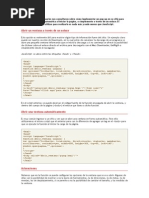 Una vez estn descomprimidos, en un directorio dentro de nuestro sitio web, que llamaremos por ejemplo "d_openpopups", ya podemos accederlos desde cualquier pgina para mostrar popups DHTML. Para ello, lo primero es incluir el Javascript con la librera. <script language="JavaScript" type="text/javascript" src="/d_openpopups/openpopups/[Link]"></script> Donde "d_openpopups" debe ser el directorio donde hemos descomprimido los archivos. Tal como est escrita la ruta hacia el script, se supone que hemos puesto este directorio en la raz del directorio de publicacin de la web. Luego, tenemos que aadir un evento onload en la etiqueta <body>, para ocultar los popups al cargar la pgina. <body onload="hideDiv()"> La funcin hideDiv() recibe el nmero de popups que vamos a utilizar en la pgina. Si tenemos un solo popup DHTML llamaremos pasando un 1 como parmetro: hideDiv(1). Si tenemos 5 popups DHTML, le pasaremos un 5 como parmetro: hideDiv(5). A continuacin, tenemos que crear las capas con el cdigo fuente de los popups a mostrar. Algo como: <div id="Div1"> Cdigo del Popup </div> Hay que fijarse que la capa tiene como identificador (atributo id) "Div1". Eso es para el popup 1. Si tuviramos otros popups, deberamos darles nombres con nmeros consecutivos: Div2, Div3 Para acabar, tenemos que hacer la llamada a la funcin Javascript que debe mostrar el popup. Esa funcin se llama createWindow() y recibe varios parmetros: 1. Ttulo de la ventana 2. Ancho de la ventana (el alto ser el necesario para que quepa todo el contenido) 3. Color de fondo de la ventana 4. El identificador de la capa (slo el numero, 1, 2, 3) 5. Si queremso que se muestre el icono para minimizar (1 para mostrarlo y 0 si no queremos que se muestre) 6. La posicin "left" de la ventana (el nmero de pseles a la izquierda de la ventana) 7. La posicin "top" de la ventana (el nmero de pixels que debe haber arriba de la ventana. Por ejemplo, una llamada posible a esta funcin sera: createWindow('Ttulo', 300, '#ffff88', 1, 0, 100, 25); Un detalle que a nosotros nos ha hecho falta cambiar para que todo funcionase correctamente, aunque no he visto explicado nada de esto en la documentacin del producto, son los directorios de las imgenes y las declaraciones de estilos que