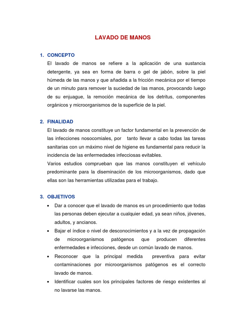 1. CONCEPTO El lavado de manos se refiere a la aplicacin de una sustancia detergente, ya sea en forma de barra o gel de jabn, sobre la piel hmeda de las manos y que aadida a la friccin mecnica por el tiempo de un minuto para remover la suciedad de las manos, provocando luego de su enjuague, la remocin mecnica de los detritus, componentes orgnicos y microorganismos de la superficie de la piel.