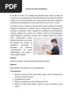 la concentracin de bacterias o flora transitoria, adquiridas por contacto reciente con pacientes o fmites. Tcnica: Retire o sbase el reloj sobre la mueca, retire anillos. Si tiene mangas largas sbalas hasta el codo. Colquese frente al lavamanos sin tocarlo con el cuerpo. Abra la llave del agua, deje correr el agua hasta el final del procedimiento. Moje bien las manos y muecas. Aplique jabn antisptico en las manos. Junte las manos, frtelas haciendo movimientos de rotacin. Entrelace las manos y frote los espacios interdigitales, haciendo movimientos hacia arriba y hacia abajo. Friccione las yemas de los dedos, de una mano con la otra para lavar las uas. Frtese las muecas. Enjuague bien las manos bajo el chorro de agua teniendo presente tenerlas en declive (ms bajas que los codos) con el fin de que el agua escurra hacia la punta de los dedos. No toque ni llave ni lavamanos, si esto sucediera debera volver a lavarse las manos.