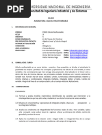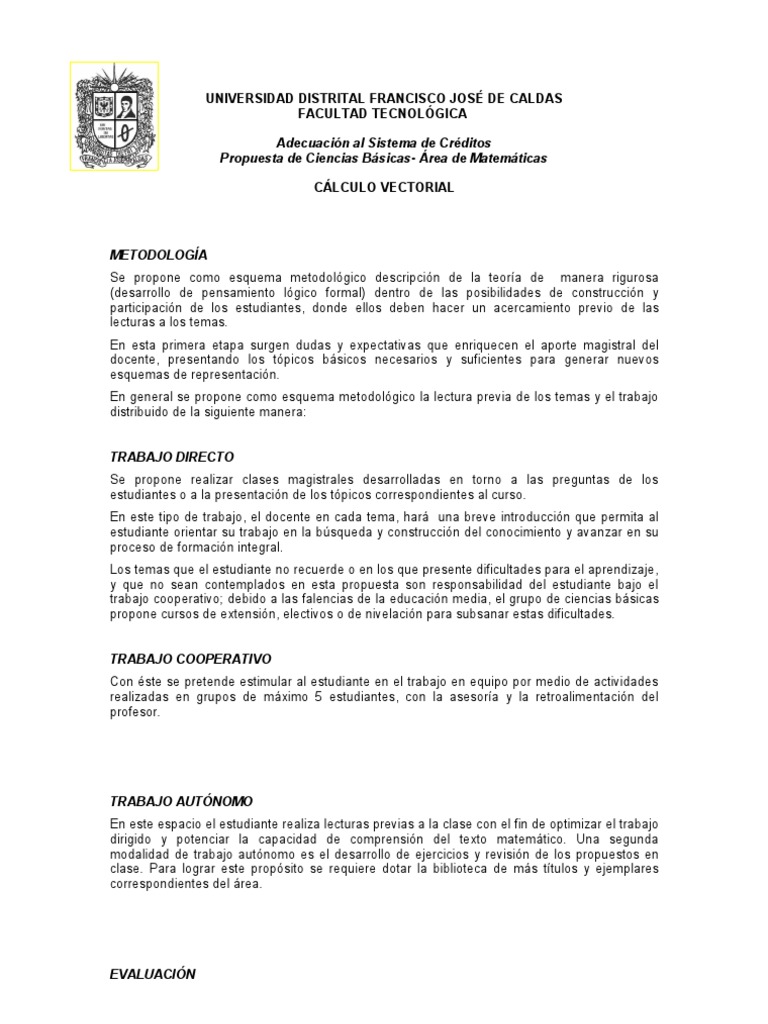 JUSTIFICACIN El estudi del calculo en varias variables es una herramienta muy importante para el ingeniero, por cuanto el modelamiento de los fenmenos fsicos y propios de la ingeniera, por lo general involucran mas de una variable independiente respecto de una o mas variables dependientes, que pueden ser en campos escalares o vectoriales Es importante destacar que desde la cultura griega se hicieron los primeros modelamientos usando los conceptos que en este curso se desarrollan, y desde entonces han surgido mltiples aplicaciones en casi todas las reas del conocimiento. Adems, cursos posteriores como el de Ecuaciones Diferenciales se apoyan en ste para desarrollar sus conceptos y procedimientos. OBJETIVO GENERAL Proporcionar herramientas que permitan al estudiante de ingeniera plantear modelos en donde se puedan relacionar ms de una variable independiente respecto de una variable dependiente, para modelar procesos ingenieriles en campos escalares y/o vectoriales. OBJETIVOS ESPECFICOS 1. 2. 3. 4. Diferenciar una funcin vectorial de una funcin escalar. Plantear y resolver problemas en campos escalares, como por ejemplo problemas de optimizacin aplicados a la ingeniera. Plantear y resolver problemas con campos vectoriales aplicados fundamentalmente a fenmenos fsicos Relacin entre un campo vectorial y un campo escalar CONTENIDO DEL CURSO