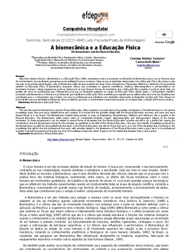 Resumo Este texto objetiv a discutir a Biomecnica e a Educao Fsica. Muito se questiona sobre as possv eis contribuies da Biomecnica para com as div ersas reas de conhecimento, que atualmente apresentam-se em mltiplas formas e contextos. Sabe-se que as ativ idades relacionadas com a Educao Fsica so muitas e cada v ez mais se encontram temas ligados a ela. A Biomecnica alm de estar presente em reas como a Engenharia, Fisioterapia, Medicina e Veterinria faz-se presente tambm na Educao Fsica. A Biomecnica enquanto cincia v isa contemplar os aspectos cinemticos, cinticos, eletromiogrficos e antropomtricos do mov imento humano. Nestas perspectiv as pode-se relaciona-la s mais div ersas formas de mov imento que a Educao fsica engloba e pode-se ainda fazer um perfeito elo entre as contribuies que a Biomecnica traz para as ativ idades realizadas no campo da Educao Fsica. Sendo assim, o conhecimento cientfico produzido pela Biomecnica til para os profissionais que trabalham na Educao Fsica e tambm para aqueles que se utilizam dela, ela uma das disciplinas que contribuem para o conhecimento que ir fazer com que os profissionais que trabalham com ativ idades relacionadas s dimenses da Educao Fsica faam um bom trabalho em suas ativ idades profissionais. Dev e-se salientar que todo o conhecimento importante quando se consegue fazer a relao entre teoria e prtica. Unitermos: Biomecnica. Educao Fsica. A bstract This text discusses the Biomechanics and the Phy sical Education. Many questions are made about the possible contributions of the Biomechanics to the sev eral k nowledge areas, that now are in multiple forms and contexts. It is k nown that the activ ities related with the Phy sical Education are many and more and more themes link ed to it are found. The Biomechanics besides being present in areas as Engineering, Phy siotherapy , Medicine and Veterinary also is present in the Phy sical Education. The Biomechanics while science seek s to contemplate k inematic, k inetic, eletromiographic and anthropometric aspects of the human mov ement. In these perspectiv es it can be related to sev eral forms of mov ement that the Phy sical Education includes and still to do a perfect link among the contributions that the Biomechanics brings for the activ ities accomplished in the field of the Phy sical Education. This way , the scientific k nowledge produced by the Biomechanics is useful for the professionals that work in the Phy sical Education and also for those that use it. It is one of the disciplines that contribute to the k nowledge that will do that the professionals that work with activ ities related to the dimensions of the Phy sical Education mak e a good work in its professional activ ities. It should be pointed out that the any k ind of k nowledge is important when /it gets to do the relationship between theory and practice. Keywords: Biomechanics. Phy sical Education. http://www.efdeportes.com/ Revista Digital - Buenos Aires - Ao 12 - N 113 - Octubre de 2007 1/1