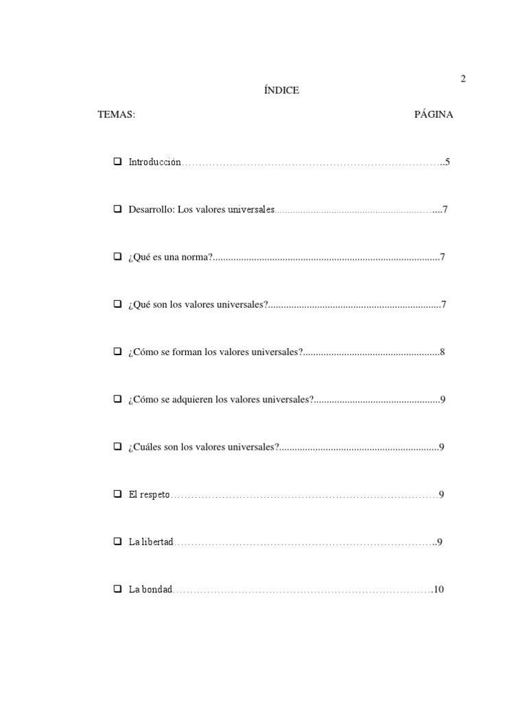 Este trabajo, adems de lo ya mencionado anteriormente, puede servir para el lector, como un indicador, pues conduce de una manera concisa y no de otra, frente a lo que pueden ser los deseos o impulsos, bien sea al estar solos o con otros. Estos valores, servirn de brjula en todo momento para tener una actuacin consistente en cualquier situacin. Ya que cuando se acta guiados por valores, no se hace por lo que dirn o darn los dems. Se acta por conviccin, sin importar si otras personas lo ven o no. Este trabajo, busca ser satisfactorio y de amenidad para todo aqul que quiera consultarlo, pues consta de conceptos claros y precisos. Adems de que ayuda de reflexin sobre lo que actualmente la sociedad est careciendo, y tomen conciencia de que los valores, son lo ms valioso que se tiene, y que nadie se imagina un mundo sin ellos.