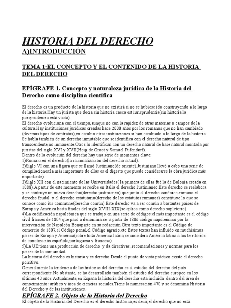 El derecho es un producto de la historia que no existir si no se hubiese ido construyendo a lo largo de la historia.Hay un jurista que deca:sin historia caeca est iurisprudentia(sin historia la jurisprudencia est vaca). El derecho evoluciona con el tiempo,aunque no con la rapidez de otras materias o campos de la cultura.Hay instituciones jurdicas creadas hace 2000 aos por los romanos que no han cambiado (diversos tipos de contratos),en cambio otras instituciones si han cambiado a lo largo de la historia. Se habla tambin de un derecho inmutable que se identifica con el derecho natural de tipo transcendente,no inmanente.Otros lo identifican con un derecho natural de base natural montada por juristas del siglo XVI y XVII(Hoig de Groot y Samuel Pufendorf). Dentro de la evolucin del derecho hay una serie de momentos clave: 1)Roma:cre el derecho(la racionalizacin del derecho actual). 2)Siglo VI con una figura que se llam Justiniano(de oriente).Justiniano llev a cabo una serie de compilaciones:la ms importante de ellas es el digesto que puede considerarse la obra jurdica ms importante). 3)Siglo XII con el nacimiento de las Universidades( la primera de ellas fu la de Bolonia creada en 1088).A partir de este momento se recibe en Italia el derecho Justinianeo.Este derecho se reelabora y se contruye un nuevo derecho(derecho justinianeo) que junto al derecho cannico-romano.el derecho feudal y el derecho estatutario(derecho de los estatutos romanos) constituye lo que se conoce como ius commune(derecho comn).Este derecho va a ser comn a bastantes pases de Europa y Amrica hasta finales del siglo XVIII-XIX(se aplica como derecho supletorio). 4)La codificacin napolenica que se tradujo en una serie de cdigos:el ms importante es el cdigo civil francs de 1804 que pas a denominarse a partir de 1806 cdigo napolenico por la intervencin de Napolen Bonaparte en su redaccin.Otro texto importante es el Cdigo de comercio de 1807,el Cdigo penal,el Cdigo agrario,etc.Estos textos han influido en muchsimos pases de Europa y Amrica(sobre todo Amrica latina,se considera Amrica latina a los territorios de conolizacis espaola,portuguesa y francesa). 5)La UE:tiene una produccin de derecho y da directivas ,recomendaciones y normas para los pases de la comunidad . La historia del derecho es historia y es derecho.Desde el punto de vista prctico existe el derecho poisitivo. Generalmente la tendencia de las historias del derecho es al estudio del derecho del pas correspondiente.No obstante, se ha desarrollado tambin el estudio del derecho europeo en los ltimos 40 aos.Actualmente,en Espaa la historia del derecho est incluida dentro del rea de conocimiento jurdico y rea de ciencias sociales.Tiene la numeracin 470 y se denomina Historia del Derecho y de las instituciones.