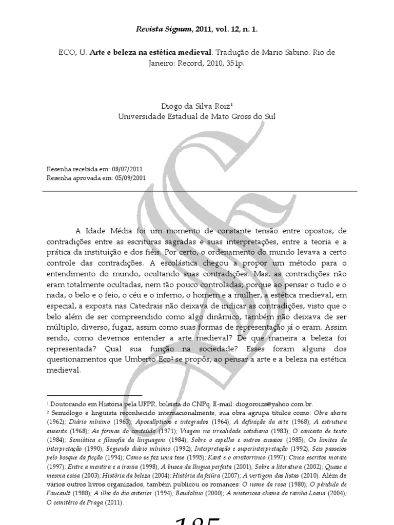 Doutorando em Histria pela UFPR, bolsista do CNPq. E-mail: diogoroizs@yahoo.com.br. Semilogo e lingista reconhecido internacionalmente, sua obra agrupa ttulos como: Obra aberta (1962); Dirio mnimo (1963); Apocalpticos e integrados (1964); A definio da arte (1968); A estrutura ausente (1968); As formas do contedo (1971); Viagem na irrealidade cotidiana (1983); O conceito de texto (1984); Semitica e filosofia da linguagem (1984); Sobre o espelho e outros ensaios (1985); Os limites da interpretao (1990); Segundo dirio mnimo (1992); Interpretao e superinterpretao (1992); Seis passeios pelo bosque da fico (1994); Como se faz uma tese (1995); Kant e o ornitorrinco (1997); Cinco escritos morais (1997); Entre a mentira e a ironia (1998); A busca da lngua perfeita (2001); Sobre a literatura (2002); Quase a mesma coisa (2003); Histria da beleza (2004); Histria da feira (2007); A vertigem das listas (2010). Alm de vrios outros livros organizados, tambm publicou os romances: O nome da rosa (1980); O pndulo de Foucault (1988); A ilha do dia anterior (1994); Baudolino (2000); A misteriosa chama da rainha Loana (2004); O cemitrio de Praga (2011).