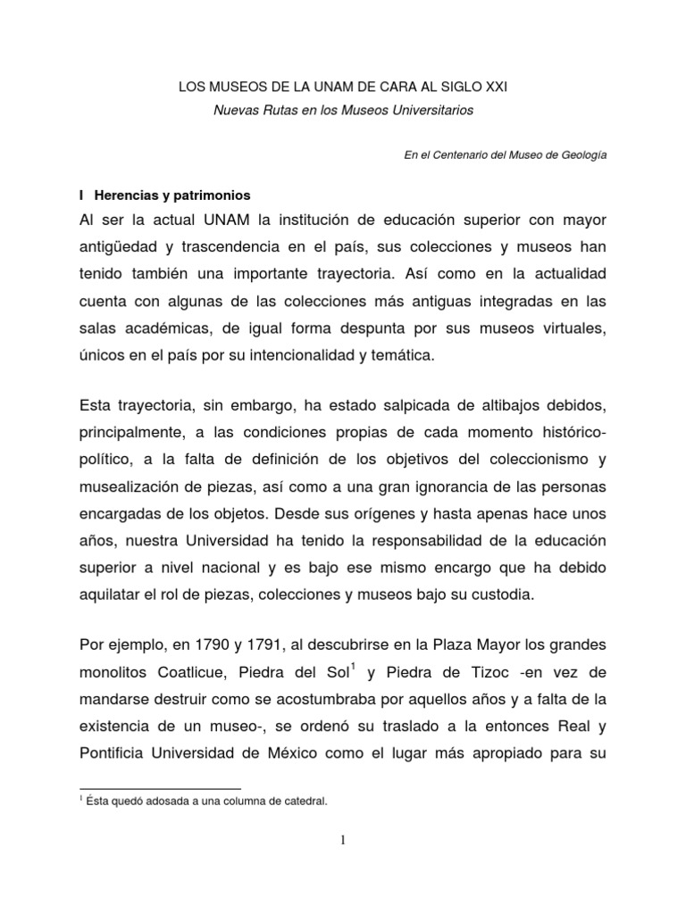 Al ser la actual UNAM la institucin de educacin superior con mayor antigedad y trascendencia en el pas, sus colecciones y museos han tenido tambin una importante trayectoria. As como en la actualidad cuenta con algunas de las colecciones ms antiguas integradas en las salas acadmicas, de igual forma despunta por sus museos virtuales, nicos en el pas por su intencionalidad y temtica. Esta trayectoria, sin embargo, ha estado salpicada de altibajos debidos, principalmente, a las condiciones propias de cada momento histricopoltico, a la falta de definicin de los objetivos del coleccionismo y musealizacin de piezas, as como a una gran ignorancia de las personas encargadas de los objetos. Desde sus orgenes y hasta apenas hace unos aos, nuestra Universidad ha tenido la responsabilidad de la educacin superior a nivel nacional y es bajo ese mismo encargo que ha debido aquilatar el rol de piezas, colecciones y museos bajo su custodia. Por ejemplo, en 1790 y 1791, al descubrirse en la Plaza Mayor los grandes monolitos Coatlicue, Piedra del Sol 1 y Piedra de Tizoc -en vez de mandarse destruir como se acostumbraba por aquellos aos y a falta de la existencia de un museo-, se orden su traslado a la entonces Real y Pontificia Universidad de Mxico como el lugar ms apropiado para su