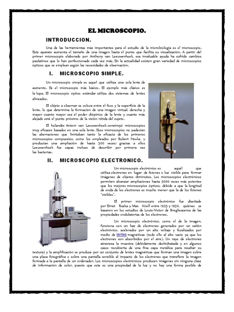 2. MICROSCOPIO DE LUZ ULTRAVIOLETA. Utiliza longitudes de onda aproximadamente 0.2 um por lo que le permite la resolucin de partculas de 0.1 um de dimetro. Estos microscopios emplean lentes de cuarzo y sistemas fotogrficos demasiados costosos para uso general. 3. MICROSCOPIO DE CAMPO OSCURO. Se emplea arreglando el sistema de lentes del condensador de tal manera que no llegue la luz al ojo al menos que sea reflejada por algn objeto que se encuentre en el campo microscpico. Las estructuras que proporcionan un contraste insuficiente con el medio que las rodea pueden hacerlas visibles. Esta tcnica es particularmente valiosa para observacin de organismos como las espiroquetas, que son difciles de observar con luz transmitida. 4. MICROSCOPIO DE CONTRASTE DE FASES. Se basa en el hecho de que las ondas luminosas que pasan a travs de los objetos transparentes, como las celulosas emergen de las fases diferentes, segn las propiedades de los diferentes materiales que lo atraviesan. Un sistema ptico especial convierte esta diferencia de fase en una diferencia de intensidad de esta forma unas estructuras aparecen ms oscuras que otras. Una caracterstica muy importante es que en las clulas vivas las estructuras internas pueden ser diferenciadas, lo que no se consigue con el microscopio ordinario. Entre estos microscopios puede incluirse el microscopio de Nomarsky o de contraste diferencial, porque por causa de su sistema de prismas, ofrece unas bellsimas imgenes tridimensionales, 5. MICROSCOPIO DE FLUORESENCIA. Tipo de microscopio muy especializado, se utiliza en inmunologa, cuando se realizan los mtodos de inflorescencia. Este microscopio es una modificacin el microscopio comn, un rayo de luz de un arco de mercurio o una lmpara de cuarzo pasa a travs de una serie de filtros de vidrio o gelatina, cuya funcin es actuar como excitadores y estn ubicados entre la lmpara y el portaobjetos. El rayo de excitacin choca sobre el material del portaobjetos y el ocular, permite que pase solo la longitud de onda emitida. Se utiliza tanto como para diagnostico directo como indirecto. 6. MICROSCOPIO ELECTRONICO. La microscopia electrnica proporciona amplificaciones utilices y ostensiblemente mayores que pueden obtenerse por medio del microscopio de campo claro (microscopio ptico). Es posible lograr estos inmensos aumentos gracias al poder de resolucin que se obtiene a partir de longitudes de onda de los haces de electrones, que se usan el lugar de la luz. Los haces de electrones tienen longitudes de onda del